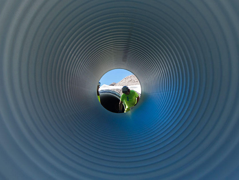 Ledningen från Pipelife är 1 400 millimeter och dimensionerad för att klara väldigt höga flöden. I samarbete med Pipelife har vi även levererat skräddarsydda dagvattenbrunnar samt ledningar för spill- och tryckvatten.