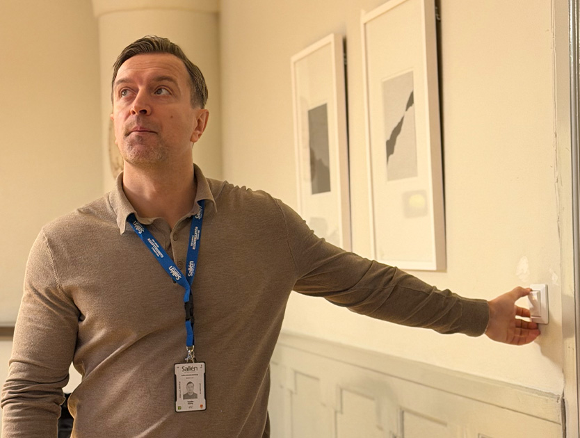 – En del armaturer har vi helt enkelt inte fått röra. I de fallen har vi varit tvungna att behålla de befintliga. I övriga delar har vi bytt ut det mesta, men alltid med stor hänsyn till arkitekturen, säger Tomislav Pecirep, serviceledare på Sallén Elektriska.