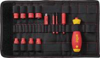 Sats med 13 elar som klarar de vanligaste förskruvningarna. För arbeten t ex i kopplingsskåp och elektriska anläggningar. Verktygen förvaras i ett vikfodral. De medföljande slimBitsen når även djupt liggande skruv- och fjäderelement. I kombination med speedE®- och slimVario®-handtagen kan de 1/4" stora hylsnyckelhylsorna användas till att dra och lossa sexkantsskruvar. Särskilt i trånga arbetsutrymmen förhindrar de helisolerade verktygen en kortslutning vid oavsiktlig kontakt mellan två ledare. Varje verktyg i satsen genomgick en styckkontroll enligt den internationella standarden IEC 60900 och gör det möjligt att arbeta säkert på spänningsförande delar upp till 1000 V AC.