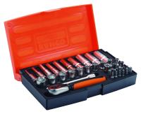 Socket wrench set 1/4", 3/8" and 1/2" with U-ring key set. Tool made of matte-chromed, high-quality steel. ISO 1174. DIN 3120. Bag of HDPE plastics. Contains 138 parts.