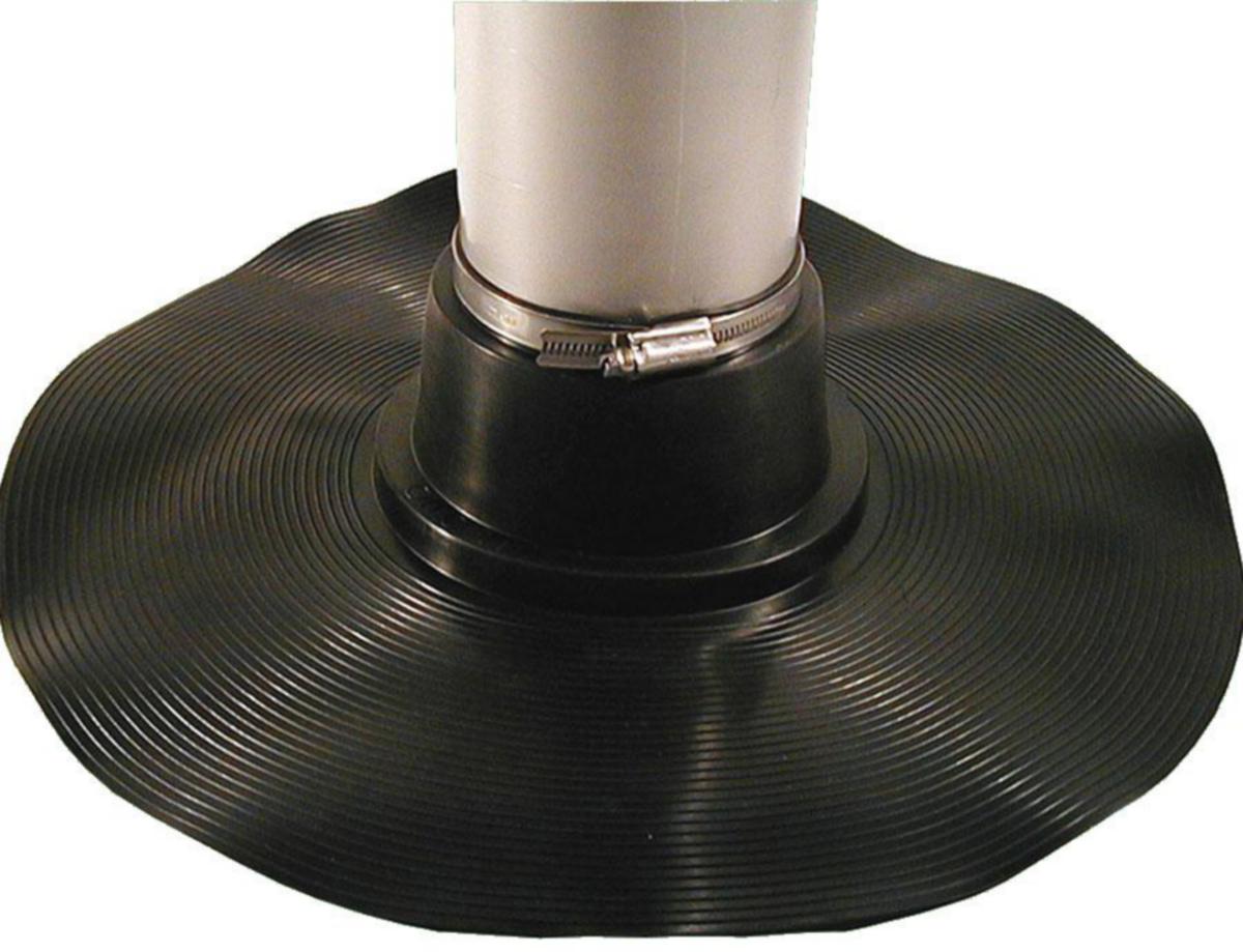 All spigots are made of weather-resistant EPDM rubber and are supplied with a wide collar in order to ensure good coverage when glueing to the sealing layer. Handles various roof slopes thanks to bellows. Consists of a staircase-shaped bellow connection, which facilitates installation on sloping roofs and contributes to a flexible joint to the building frame. A hose clamp is supplied. Material: EPDM. Work temperature: -55° - + 100°C, hort-term up to 120°C.