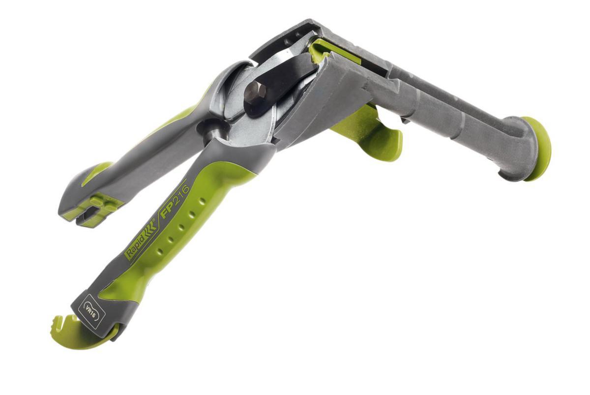 With soft, ergonomic handle. Storage for VR16 ring clamps. Used for fixing thin fence.