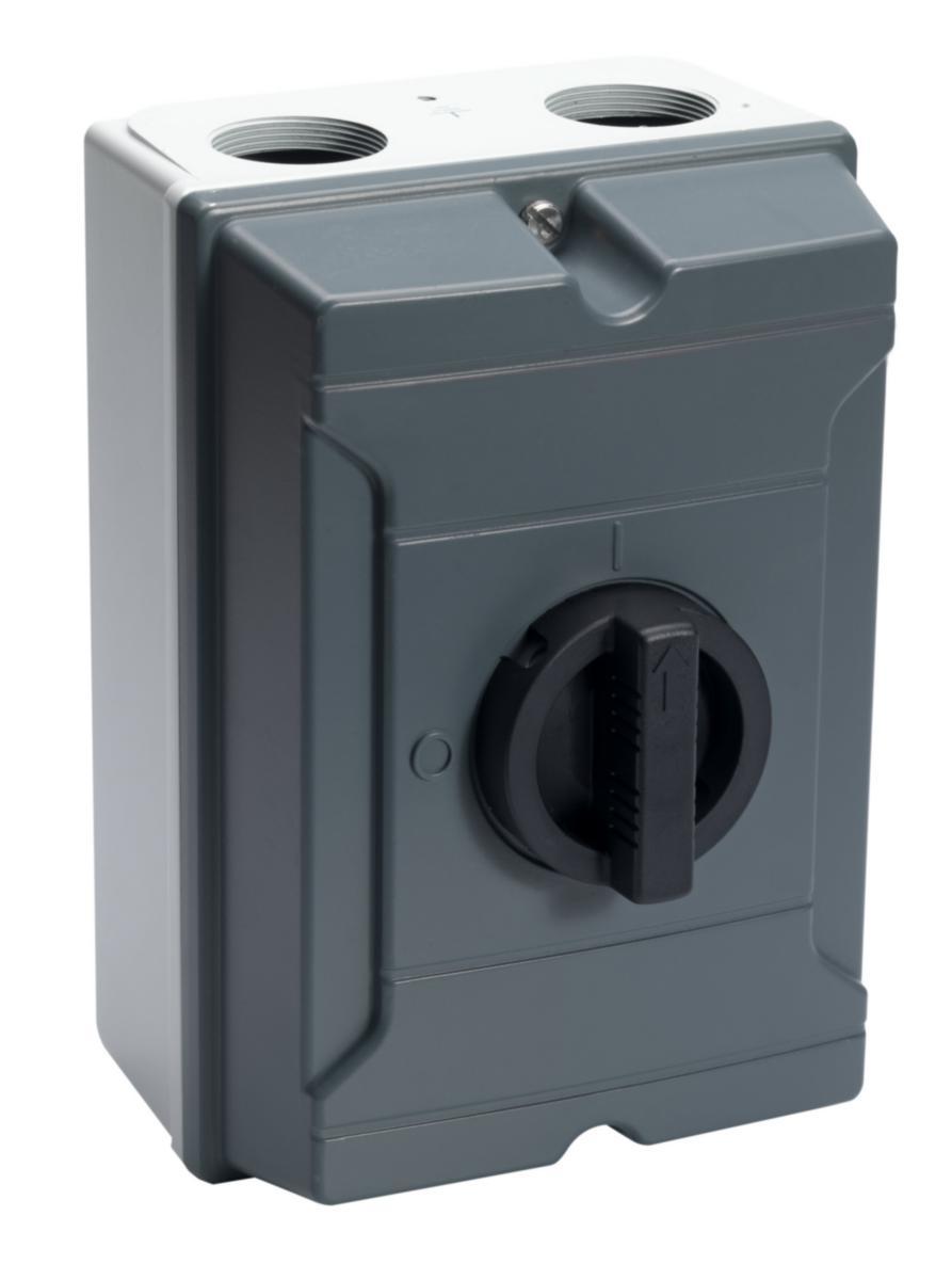 The enclosures are made of aluminium alloy and enamelled with a light grey box and dark grey cover. The encapsulations have M-threaded insertion openings. LBAS 325 is equipped with an extra hole M16 downwards for a signal or auxiliary contact cable. Supplied with sealing nipples (IP54) in every switch. All switches are equipped with a closing auxiliary contact. They can be supplemented with an extra auxiliary contact. The switches can be locked in the O position. After the opening of knob's “knock out", the switches can also be locked in the I position, LBAS345, 375 and 390 can then be locked with four padlocks in both O and I position. Locking strap L6 (31 458 70) can be used with up to six padlocks per locking strap. Neutral terminal for 5-conductor system included. Switches are halogen-free.