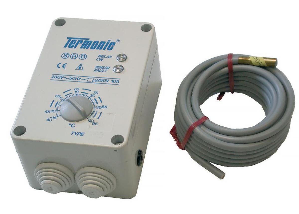 With a PTC-type sensor (included), not polarity-dependent, 3 m cable. Light diode ind. for a switched-on load (yellow) and sensor error (red). Switches for various temperature areas. Adjustable switch diff. (1-10°K). For walk-in refrigerators, air conditioning systems, heating cable systems, living spaces etc. Switching power 2.3 kW 10 A/250 V.