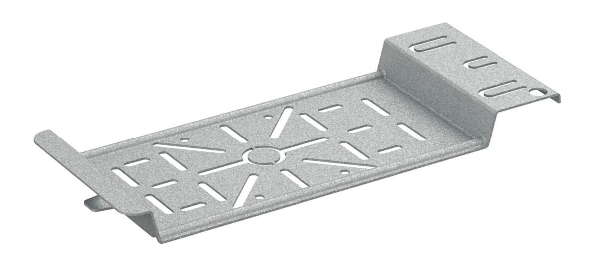 Perforated junction box plate, mounted horizontally between the ladder rungs. The tabs are bent towards the ladder rung to firmly lock the junction box plate. The middle tab is folded towards perforated rung and the two outer tabs are turned towards round rung. Used for mounting of boxes, fittings, etc. For protective earthing of junction box plate, use earthing terminal type W79
