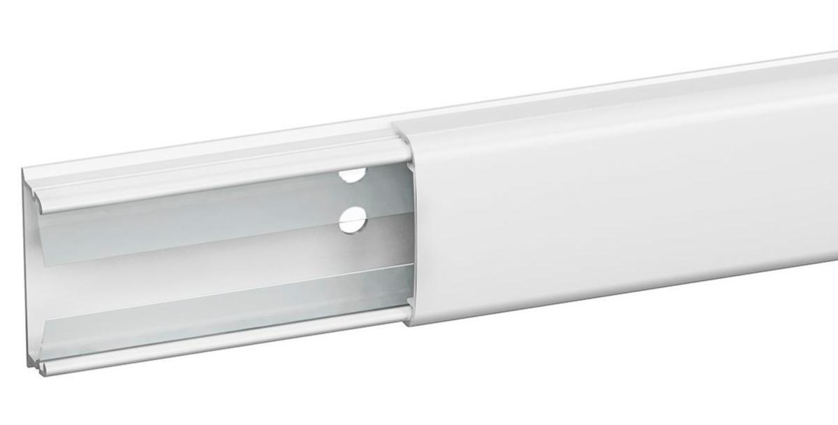 OptiLine mini-duct for high- and low-voltage power lines; hole-punched bottom section. Plastic version approved for single-insulated cable. Please use a screw E1534909, which has an insulating collar. Tape installation only for low voltage. Removal requires tools.