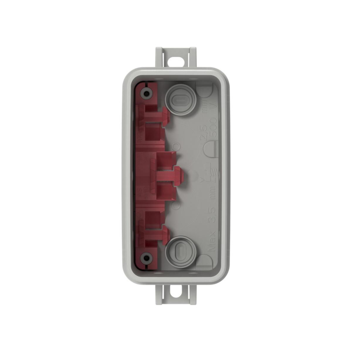 The two-component junction box is equipped with built-in "throttling nipples"; 12 entries in the sides and 2 in the bottom. You insert the cable by pushing the cable ends through the membrane. For cables max. Ø 17 mm. The box closes with a push on each corner of the lid (snap-on). If necessary, the cover can be opened by slightly turning with a screwdriver under the edge. The box can be equipped with strain relief and 5-pole terminal AS9. Made of halogen-free material (IEC/61249-2-21)