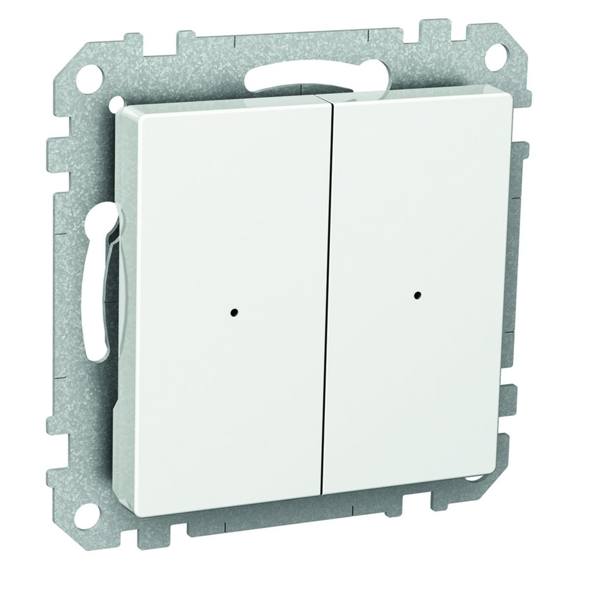 KNX rocker push button designed with one or two rocker switches with corresponding status indication. Rocker switches without marking. Bus connection is via the accompanying bus connection clamp. For recessed mounting on the apparatus box c/c, 60 mm. For surface mounting box 35mm is used. Supplemented by optional Exxact frame.