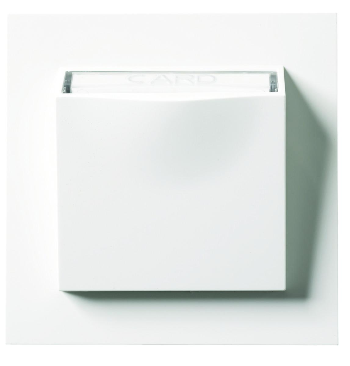 Key card switch for recessed mounting. Frame and centre plate of halogen free thermoplastic. Screw connection for connectors. Designed for combined installation or an outside surface mounting with an extension frame 20 mm. 1 and 2-pin connector is possible. Alternating contact for indication. Key card with max. width 54 mm can be used. Assembly depth 11.5 mm.
