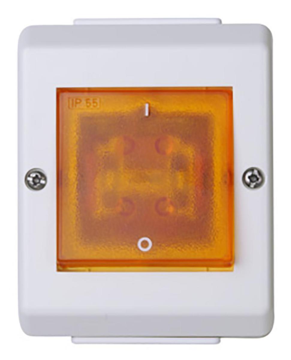 Switch for surface mounting, 16A, 250V, with light. IP55/IP54. Fluorescent lamp 10A. Made of halogen-free thermoplastic. Screw connection for connectors. Dual connections per phase. Extra switching clamp for bi-conductor. Equipped with grommets Supplied complete with glow lamp, 1.2 mA, min 60V. Switch distance 3mm.