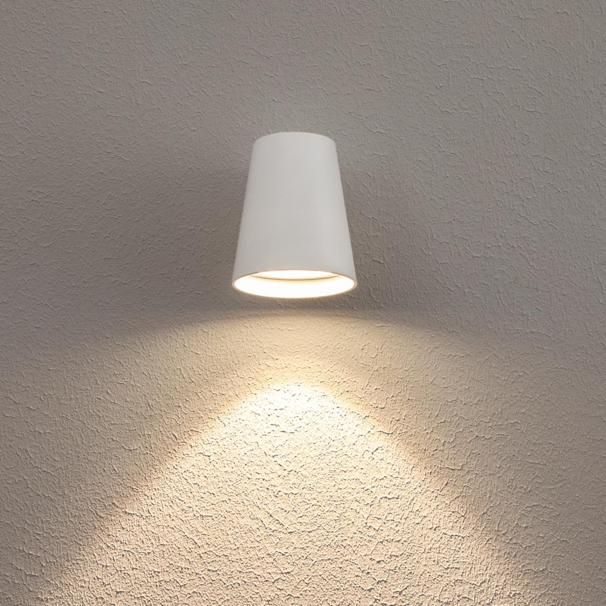 A neat facade luminaire in a stylish cone-shaped design. LED COB with reflector optics provides an asymmetrical light image that illuminates both wall and ground. Easy installation thanks to a separate back piece with double bushings and a connectable quick-connect terminal block. Spacers for surface wiring are included. IP65-rated with durable powder coating for harsh environments, in white, gray or anthracite. Built-in drive with adjustable light level via DIP switch. Possibility of dimming is available with external drive, see operating instructions