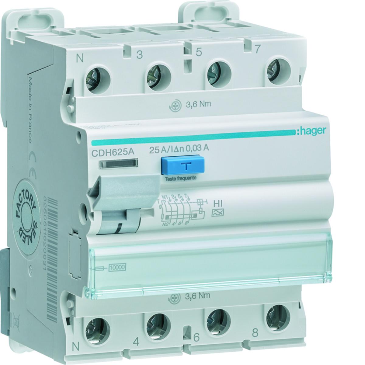 The earth-fault circuit breakers are of the electromechanical type. They are available in 2-pole and 4-pole versions type A + High immunity, protection against 8/20 wave (surge protection) and unwanted tripping, with rated fault current 30mA and 300mA. All can be provided with an auxiliary contact to indicate that the earth fault circuit breaker has tripped.
