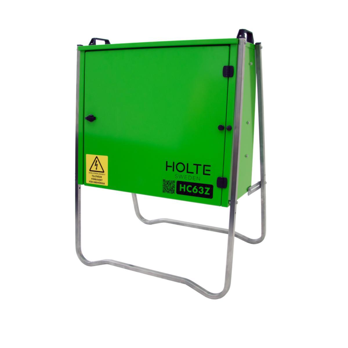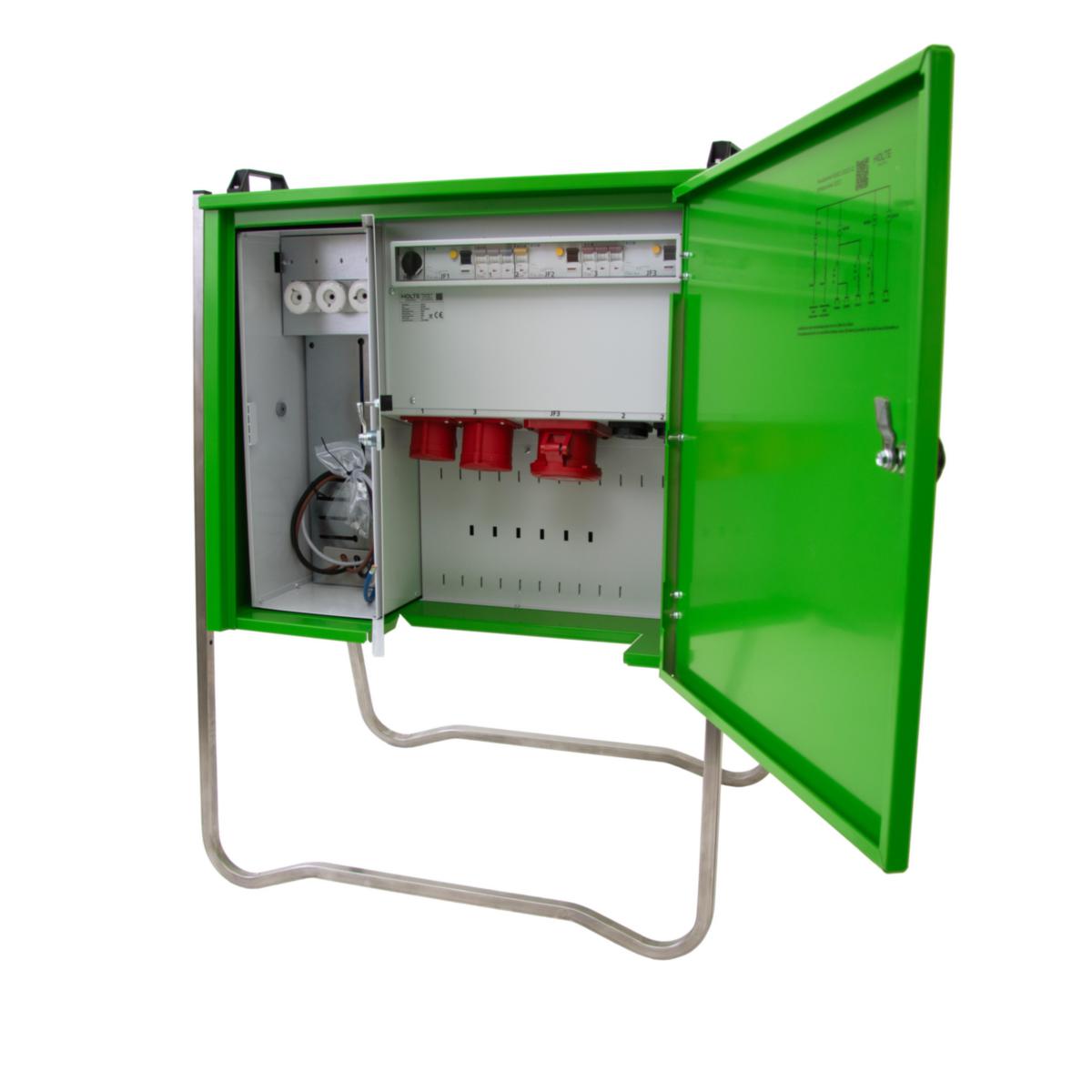 Metering center for temporary electricity for, for example, construction production or events. Strong construction with folding stainless steel stand, lockable cabinet, sealable space for connection. Equipped with incoming terminal connection for the network owner's cable, meter cabinet, main switch, relay terminal, and various sockets. 1x63A/400V, 1x32A/400V, 1x16A/400V, 2xschuko/230V. Residual current circuit breaker 2x40/0.03A and 1x63/0.3A.
