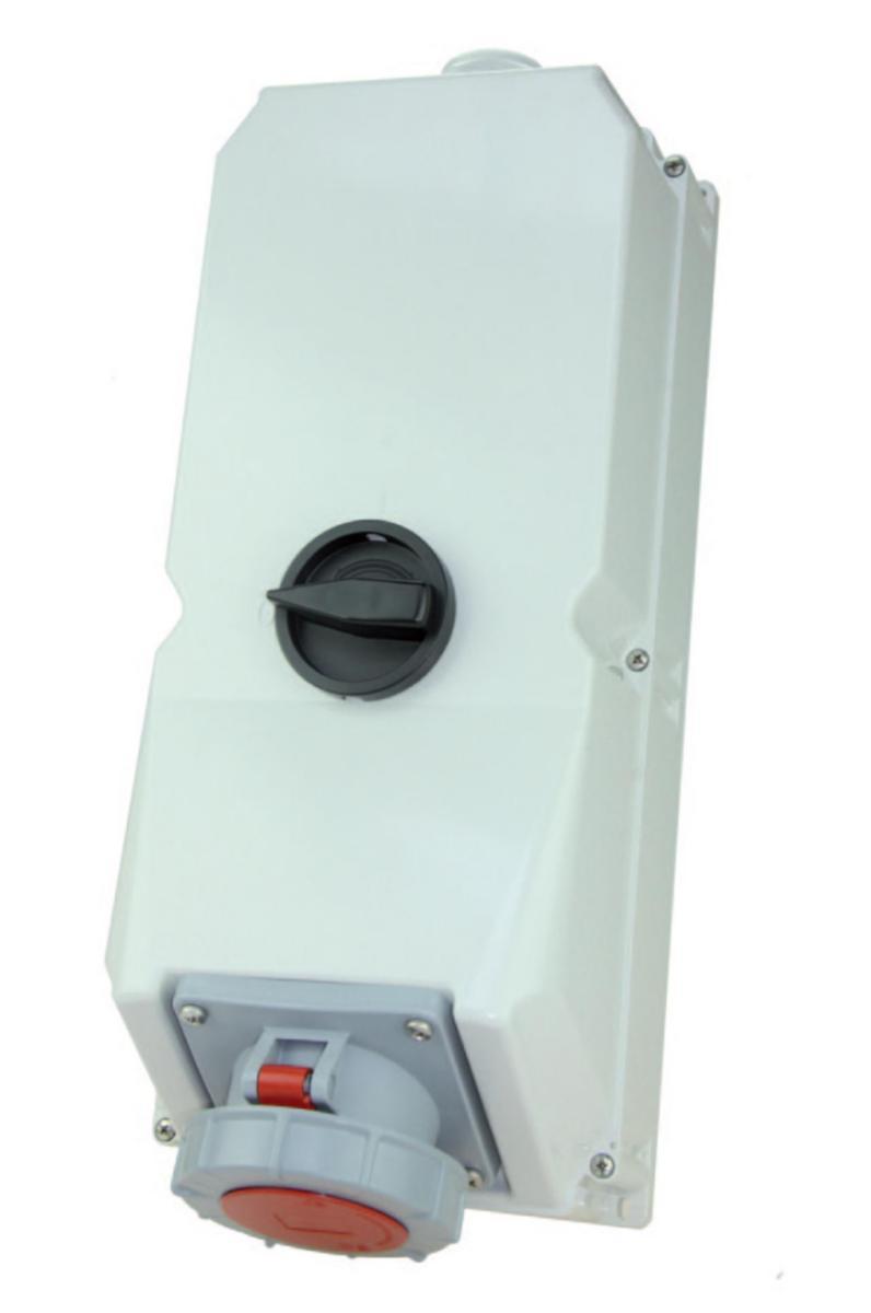 Blocked, watertight outlet for wall mounting, with an on/off lockable IEC/CEE socket on the front, plenty of coupling space. Supplied with nipples specific for the box ordered. Cable entry options through the top.