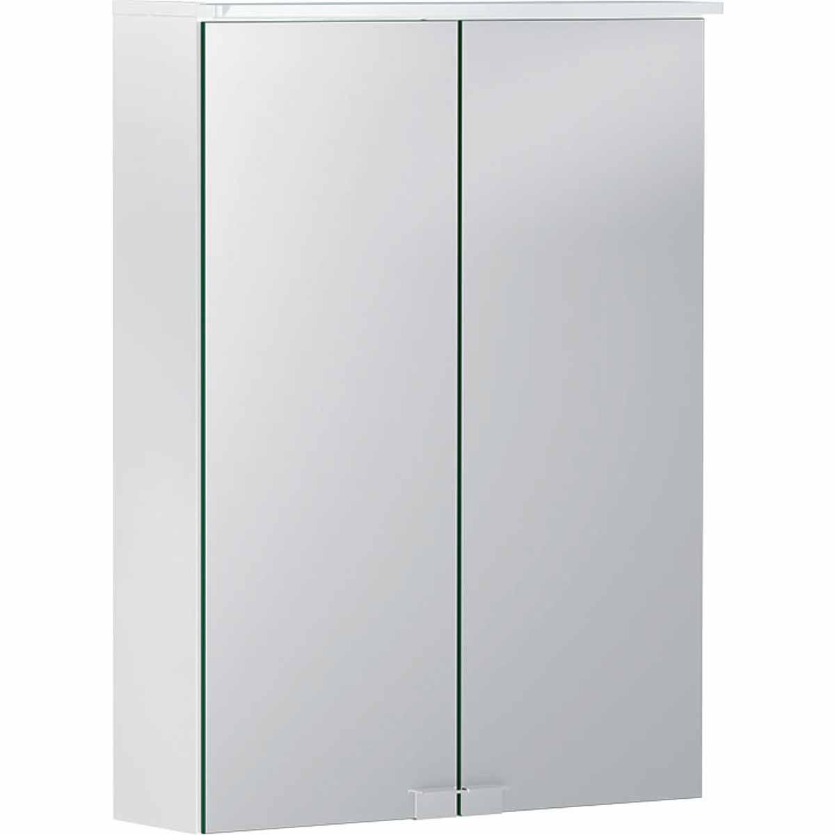 Geberit Option Basic mirror cabinet with lighting, two doors. Plug type=CEE 7/16, painted matte/white, mirrored inside and outside.