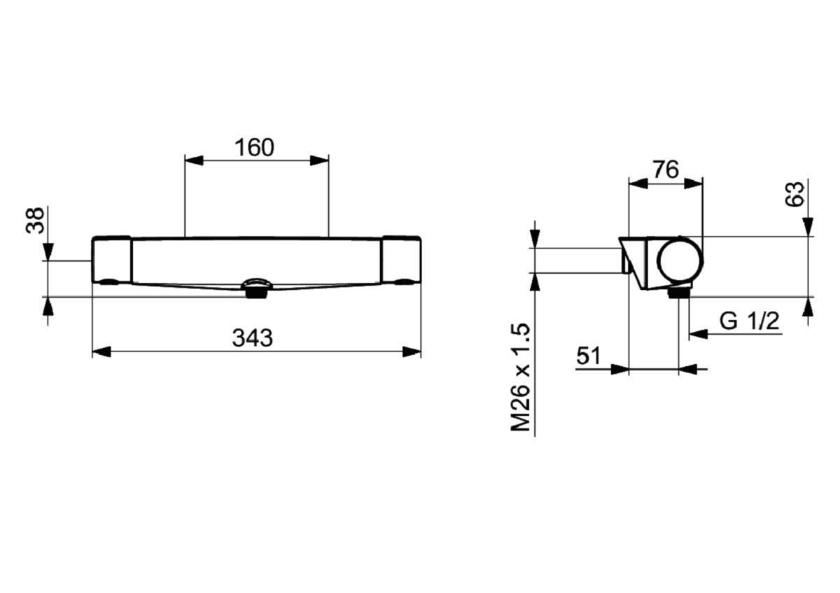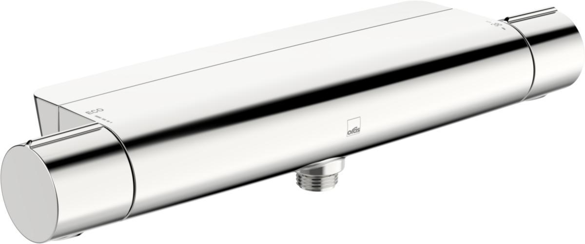 Thermostat mixer for shower. User-friendly knob with temperature limitation button 38°, control for Eco flow via push button. The mixer is equipped with non-return valves and dirt filter.