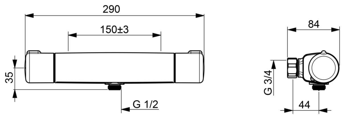Thermostat mixer for shower. Temperature dial with safety lock at 38°C, volume dial with control for Eco-flow, ceramic upper part. The mixer is equipped with check valves and dirt filter.