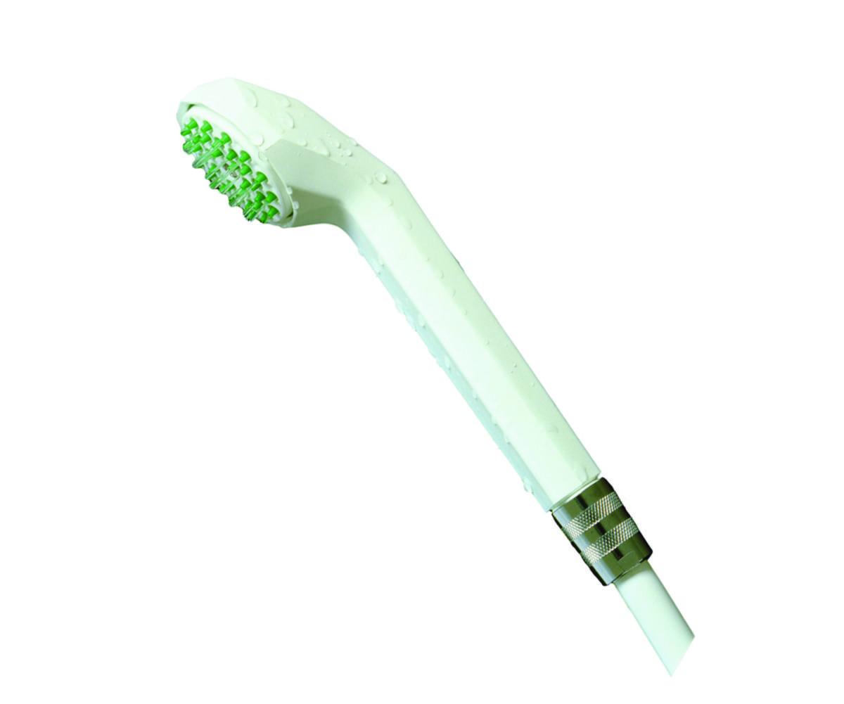 White hand shower with fixed throttling which produced a water flow of approx. 8.5/9 lit/min.