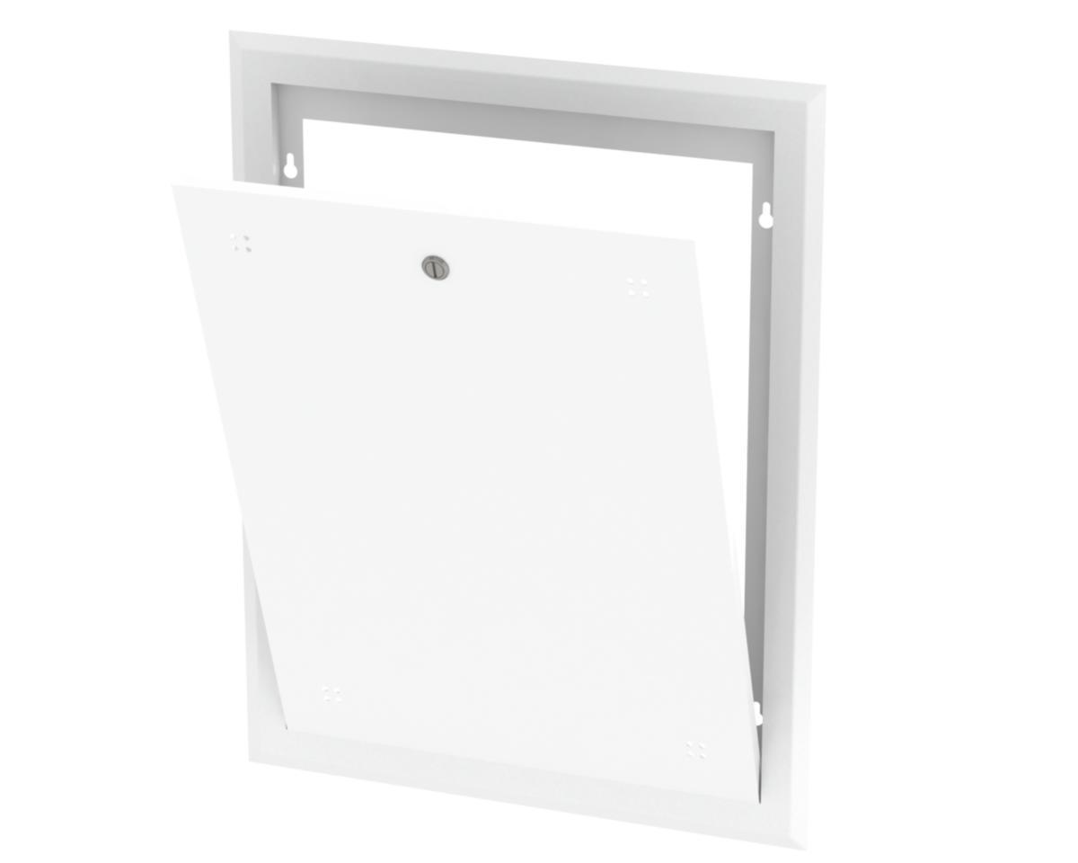 Front consisting of frame and door in powder-coated sheet metal for distribution cabinet mounted in ceiling. Leakage indication takes place through holes in the lid. Mounted against the cabinet with existing screws. The hatch has a lock with a chisel groove, but the locking piston with key can be ordered separately. The cabinet frame is mounted at least 50 mm from the wall angle to make room for the frame. Color RAL 9016.
