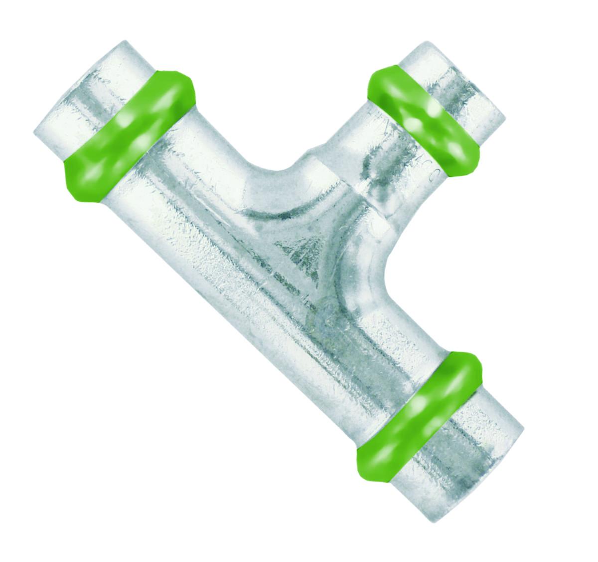 T-piece with reduced branch in chromed copper alloy, with leakage indicator (LBP) in unpressed condition, O-ring in EPDM not resistant to oils and mineral greases, pressed with V-jaws.