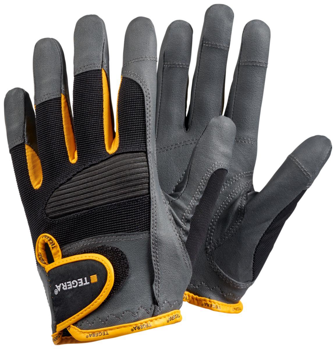 Glove with good fit and grip. The material can breathe and the glove feels comfortable on, even during long work shifts. The polyester upper has a neoprene knuckle protector. The finger sides are fitted with a ventilating mesh fabric that keeps the hand cool. The Velcro closure holds the glove firmly in place.