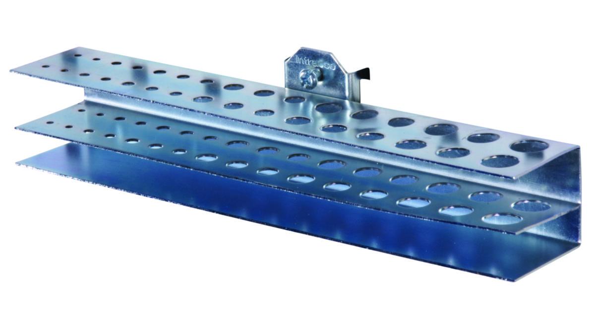 Drill holder with room for 32 drills of different sizes. Galvanized. The hook fits perforated panels, where it is hooked into the sheet metal perforation and locked with a stop screw.
