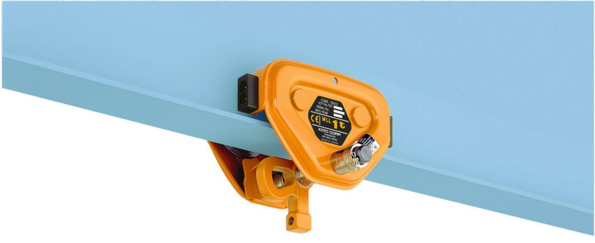 Push trolley with unique properties for horizontal transport of goods in I beam. Steel pressed ball bearing runner with little friction to I beam flange, easily rolled with silent operation. Are available for loads from 500 kg to 20 tonnes, beam width up to 300 mm, with undriven travel movement type TSP or reel driven type GTK. The trolleys are equipped with rubber buffer which dampens the stop. KITO trolleys are also available as electric trolleys with 1 or 2 speeds.
