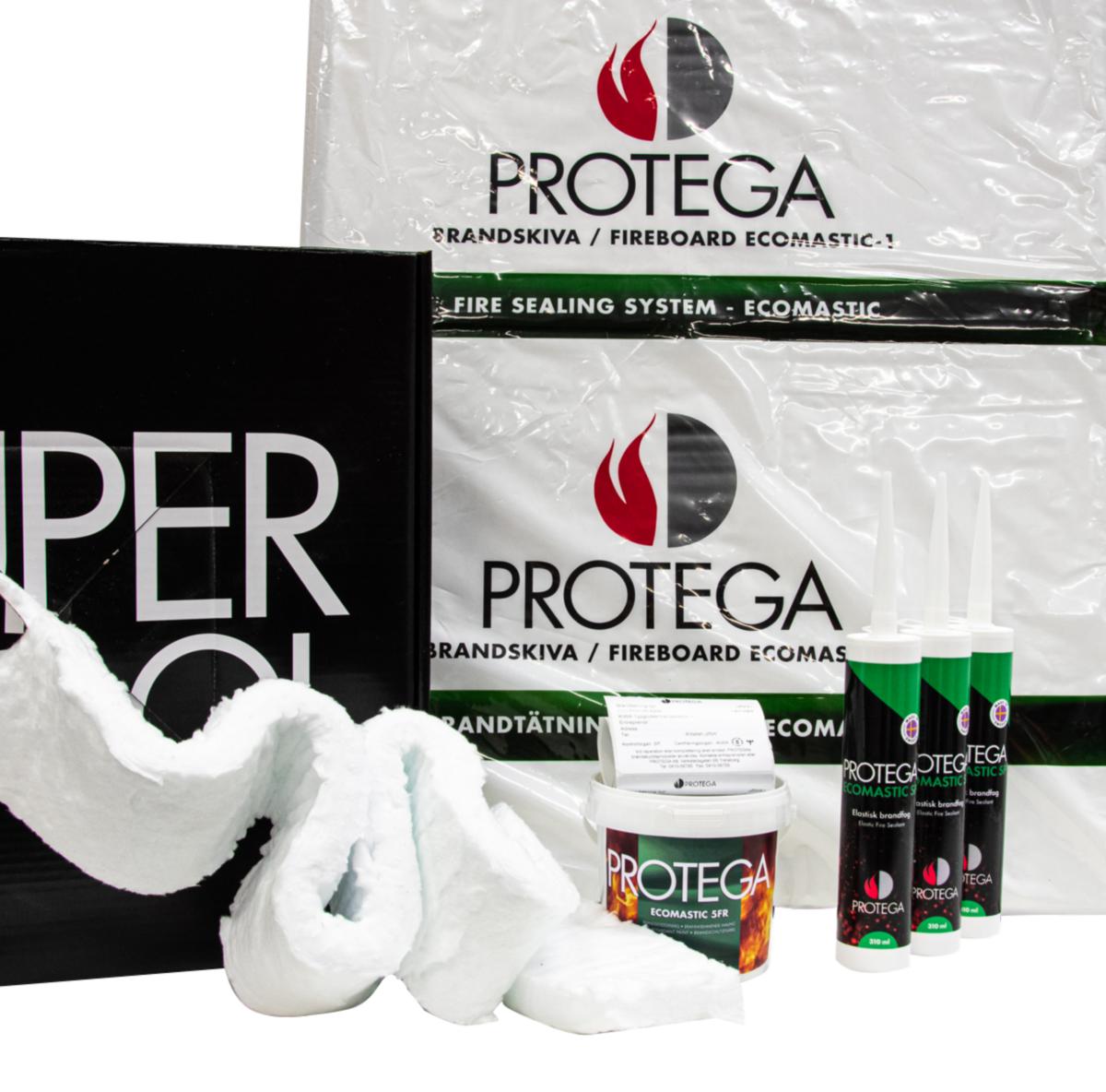 Protega Fire seal kit EL +. Fire seal kit for cable, cable ladders, pipes and ventilation ducts. Fire class up to EI120. Complete package for installation in fire-separating solid wall / floor or rule wall. The seal is overpaintable and it is easy to supplement with more penetrations at a later stage. products are part of a system and are approved according to ETA17 / 0767 and ETA17 / 0764.