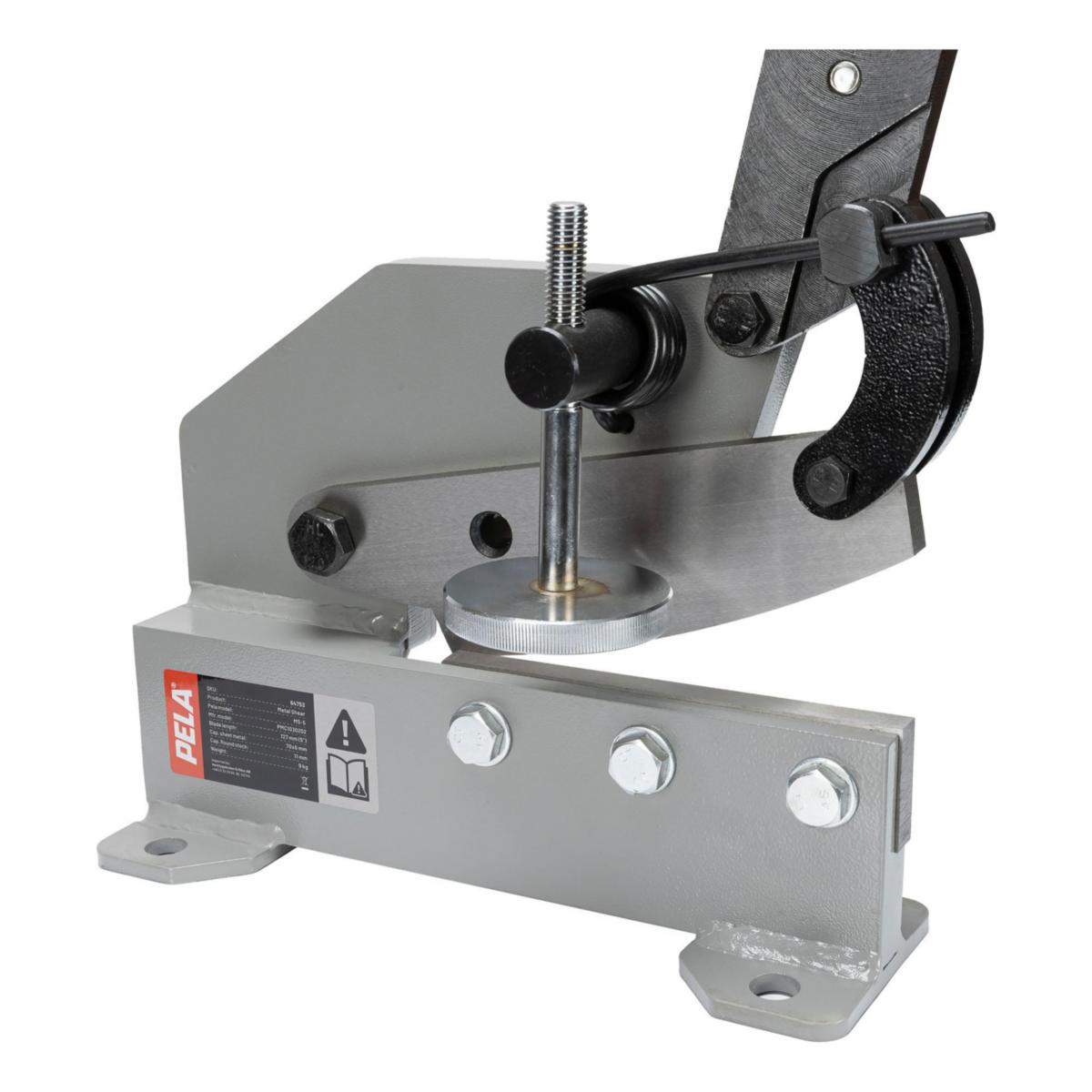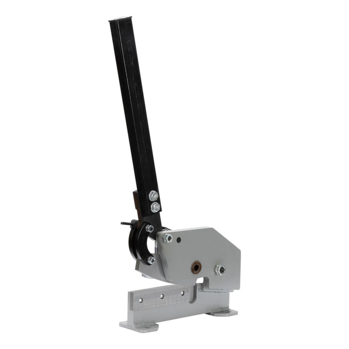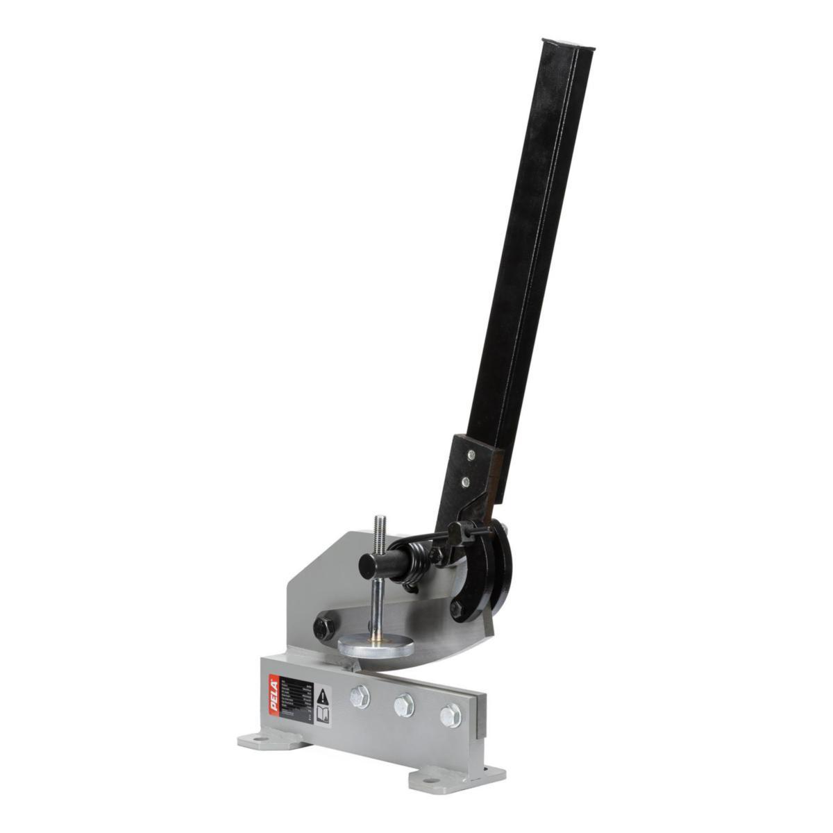 Hand-operated sheet metal shear for bench mounting. Equipped with adjustable hold-downs. Lever arm fitted with return spring. Capacity: steel 5 mm, flat iron 5 mm, round iron 10 mm.