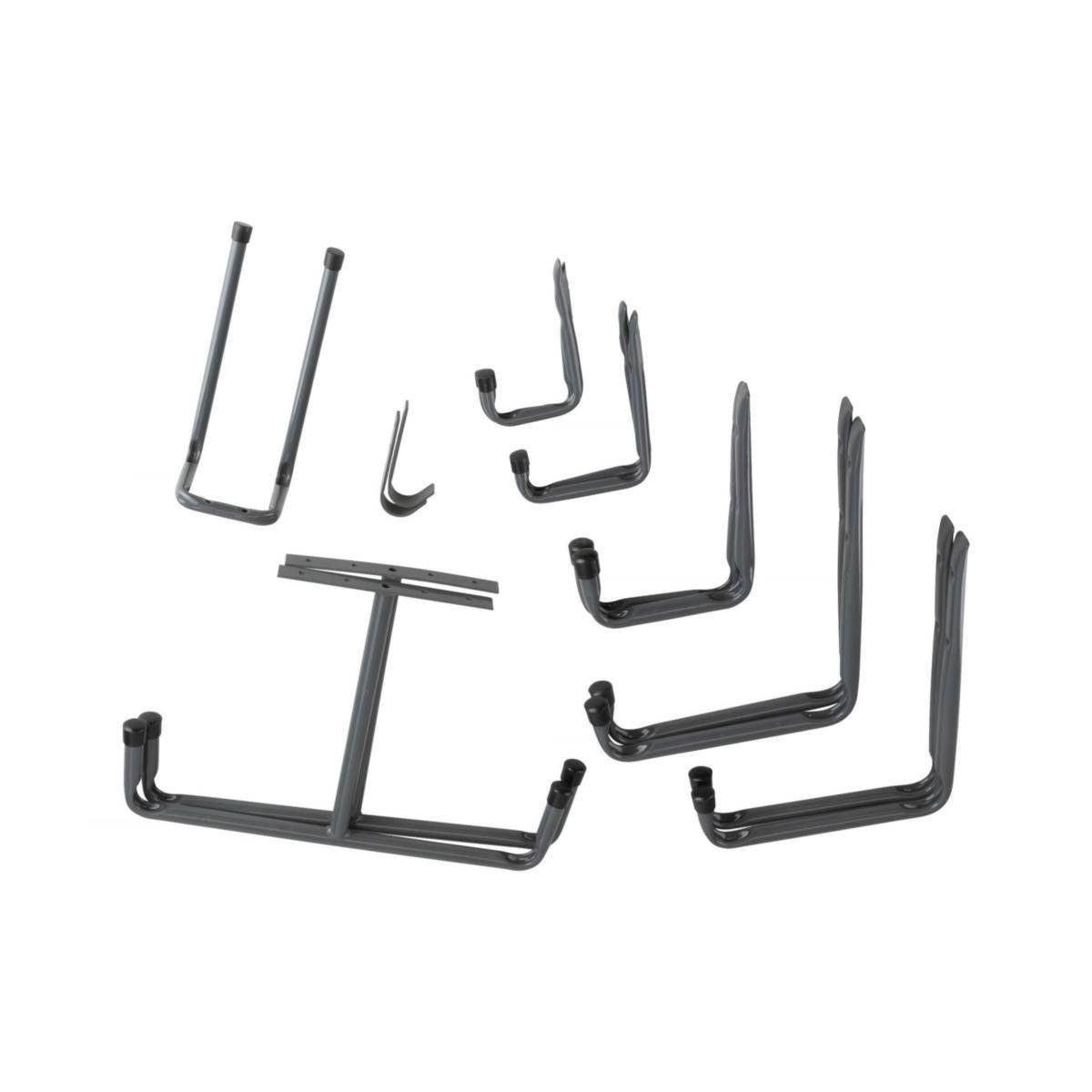 Set of 15 tool hooks in various sizes and shapes designed for hanging tools and equipment. The hooks are made of powder-coated steel that resists rust and wear. Hooks have rounded ends with plastic protection to prevent scratches on the equipment. The hooks are easy to mount on walls, ceilings, rails, or other storage systems. The package contains 2 wall hooks 150 mm, 4 wall hooks 250 mm, 2 wall hooks 82 mm, 2 wall hooks 115 mm, 2 double ceiling hooks 450 mm, 2 universal hooks 32 mm, and 1 tool hook 198 mm.