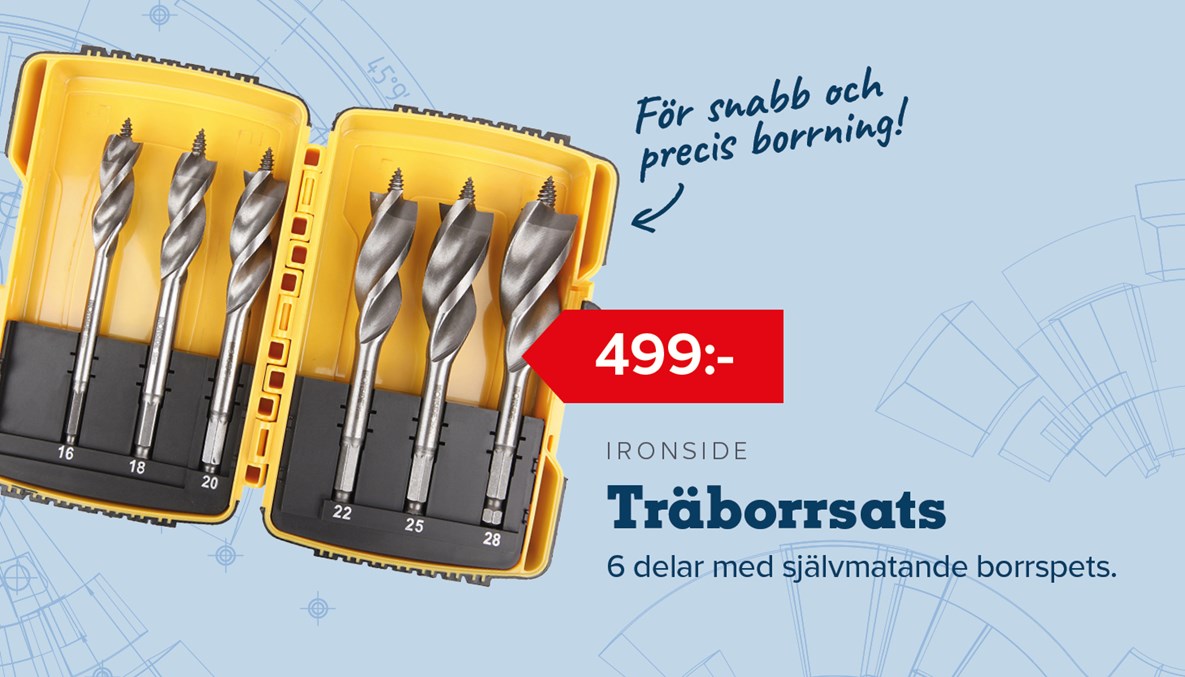 Borrsats för trä samt trä med spik med sex borrdimensioner från 16-18-20-22-25-28mm. Tillverkad med HSS-spets för hög slitstyrka och sandblästrad yta för lång livslängd. Självmatande skruvspets ger snabb och effektiv borrning i både hårda och mjuka träslag samt trä med spik. Tre skärande sporrar med tre skäreggar ger ökad hållbarhet och minskar slitage. Tre spånkanaler säkerställer effektiv spånavgång under borrning. Hex-fäste 3/8" (1/4" på 16mm) möjliggör snabb verktygsväxling och är anpassat för sladdlösa borrmaskiner. Produkten är avsedd för professionellt bruk inom bygg, snickeri och installation där precision och hållbarhet är avgörande.
