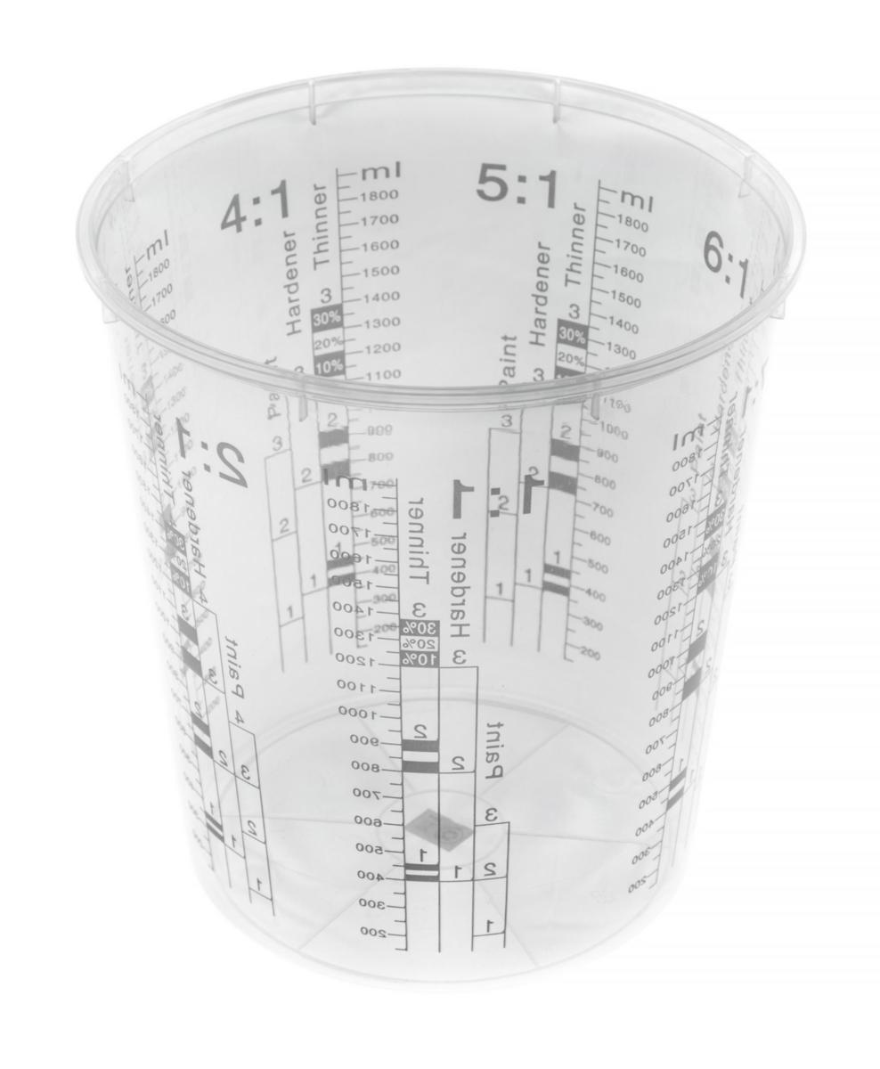 Blandkopp med tydliga graderingar för blandningsförhållande mellan färg, härdare och förtunning.