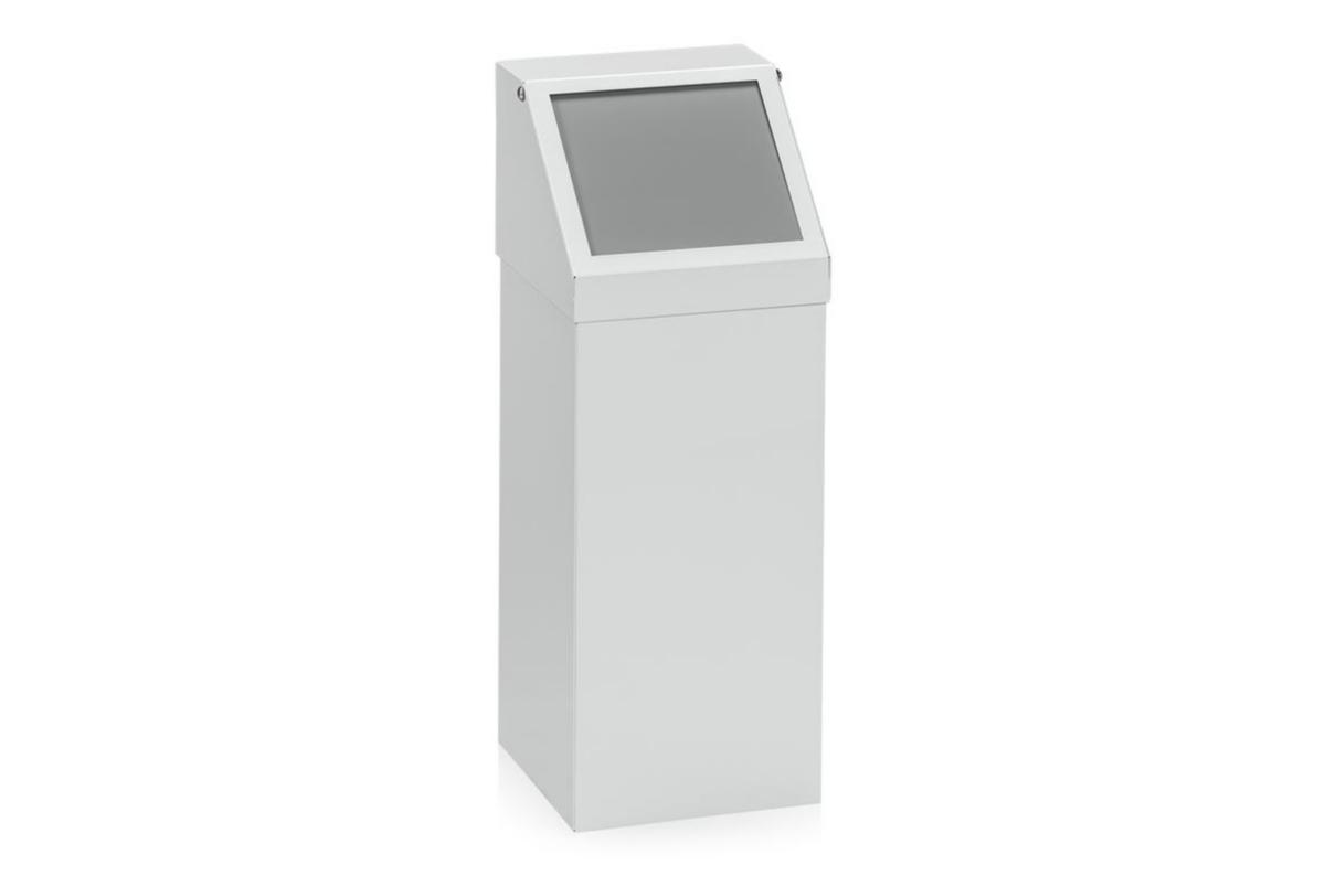 Praktisk och robust avfallsbehållare i plåt. Pulverlackerad i en mycket tålig strukturlack, grå RAL 7037. Vippbart lock framifrån. Enkel tömning med avtagbar överdel.