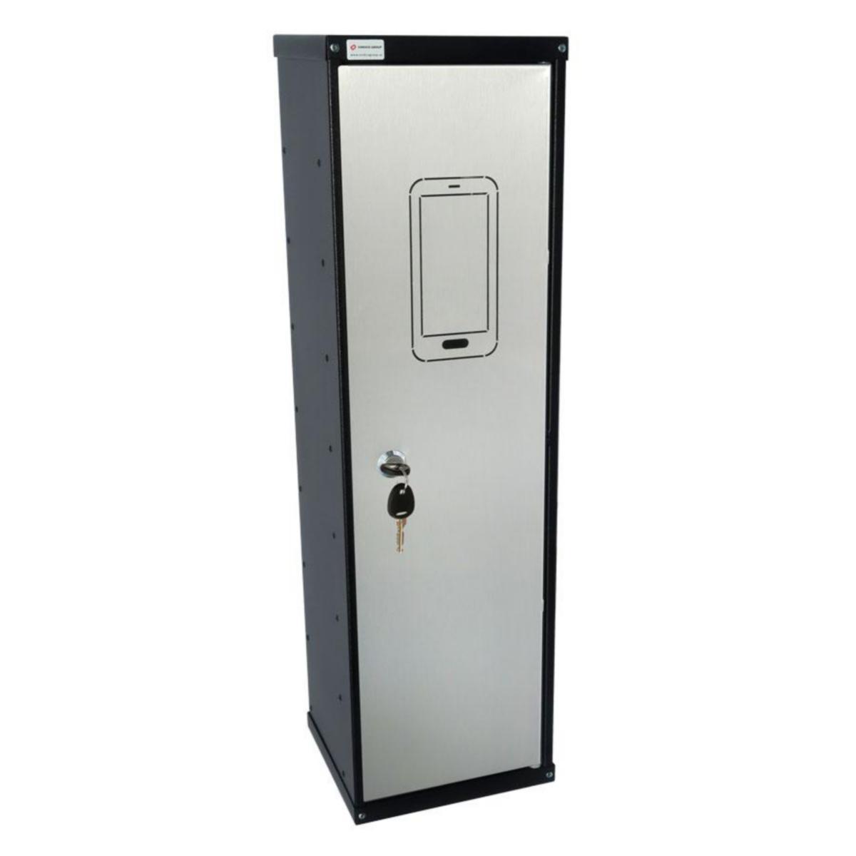 UNITEL 8 MOBILSKÅP 1 LUCKA är uppdelat i två sektioner, en där laddarna placeras och en med hyllor där telefonerna placeras. Sladden leds från laddaren till telefonen i ett spår vilket gör att den är lättillgänglig för användaren. Tillverkas i 2 mm plåt och lackas i allt utom luckan med svart strukturfärg. Luckan är tillverkad i rostfritt stål. Levereras med två nycklar och beställs flera skåp finns möjligheter till likalåsning eller huvudnyckelsystem.