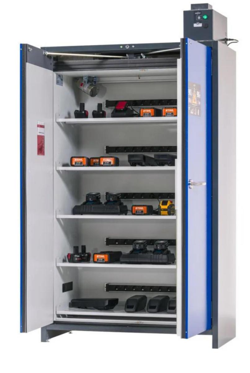 Laddskåp för förvaring och laddning av Litiumbatterier med fem hyllplan och ett integrerat golvuppsamlingskärl för uppsamling av eventuellt läckage. Varje hyllplan är utrustat med eluttagslist med metallhölje och upp till 10 jordade eluttag. Eluttagslisten är driftklar och sitter på skåpets bakre vägg. Skåpet är typgodkänt brandklassning på 90 minuter för utvändig brand enligt SS-EN 14470-1 och brandsklassning på 90 minuter för invändig brand enligt SS-EN 1363-1. Integrerad, underkörningsbar sockel som underlättar förflyttning. Låsning av dörrarna med sker automatiskt med 2-punktslåssystem. Inklusive brandlarm och potentialfri larmkontakt till fastighetsstyrning. 400 V-kabel ingår i leveransen. Vid uppställning rekommenders att skåpen placeras på plant underlag, från vilket det i händelse av olycka snabbt kan evakueras.