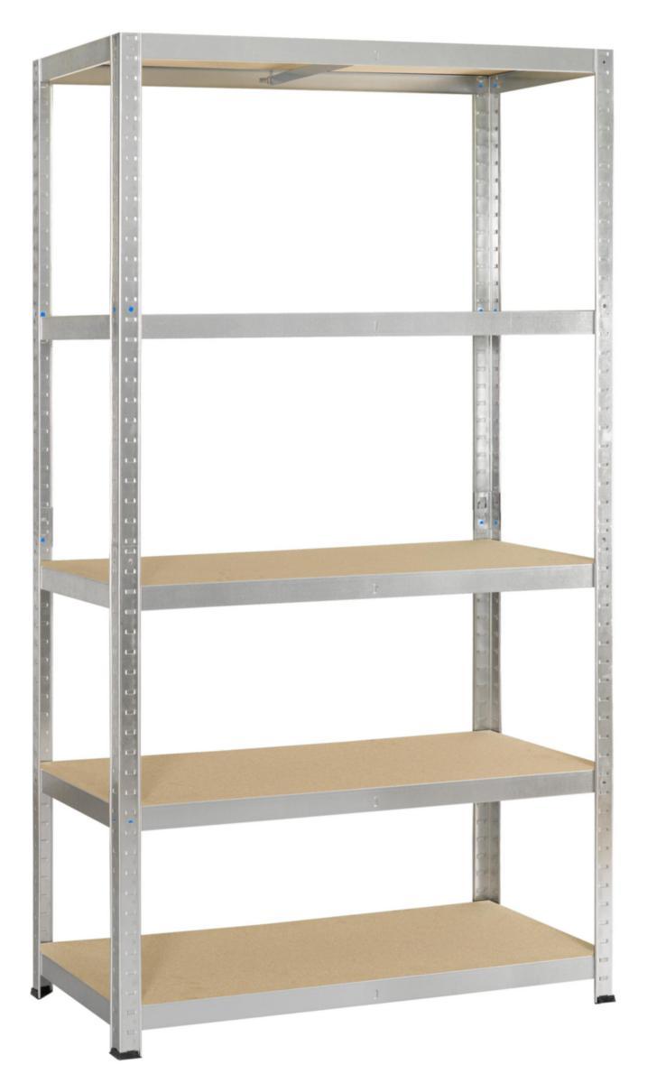 För lager, verkstad och förråd. Lätt att montera – helt utan skruvar, levereras omonterad, stolpar av varmförzinkad plåt och 5 st hyllplan av spånskiva, kapacitet/ hylla 300 kg. Gavelstolparna levereras delade på mitten i samma kartong som hyllplanen och skarvas ihop vid montering.