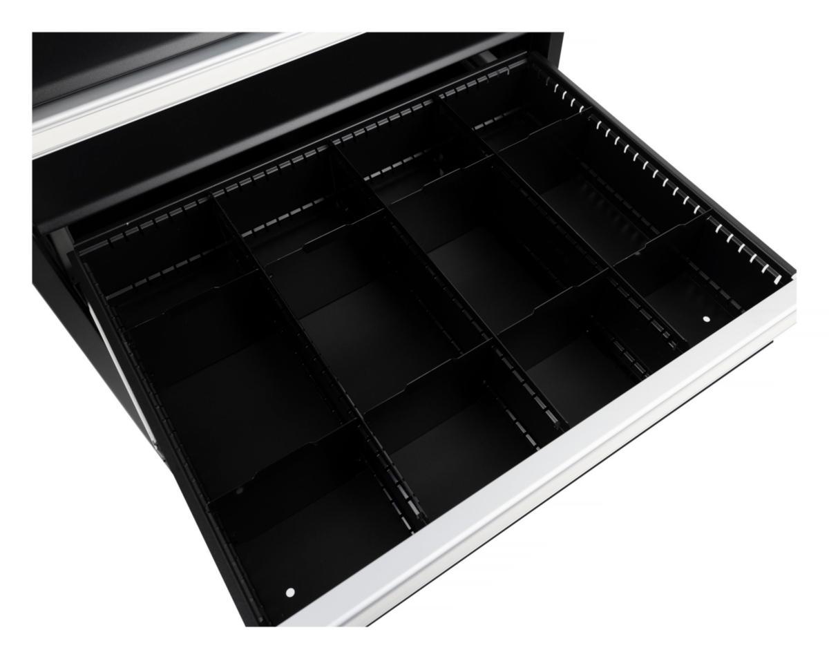 Garage- eller verkstadshurts med 9 st utdragbara lådor som klarar en belastning på hela 75 kg per låda. Tippskyddet tillåter endast en låda att vara öppen i taget. Hurtsens alla lådor har låsspärr i handtaget som förhindrar lådorna från att öppnas oönskat. Hela hurtsen går att låsa med nyckel för säker förvaring av dina verktyg. Handtagslisterna har inplastade skyltar om man vill märka upp innehållet i lådorna.