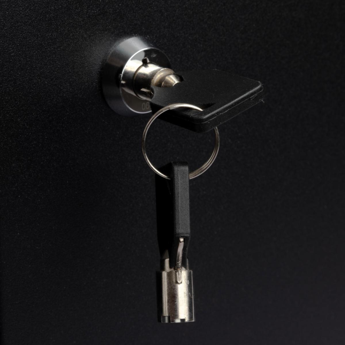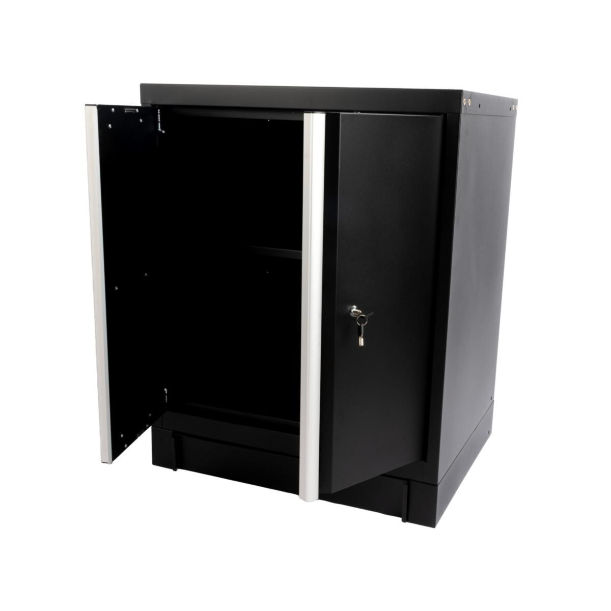Skåpshurts av helsvetsad svartlackerad stålplåt. Skåpet är försedd med hylla samt 2 st dörrar som går att låsa med medföljande nycklar. Storlek: 720x573x900 mm.