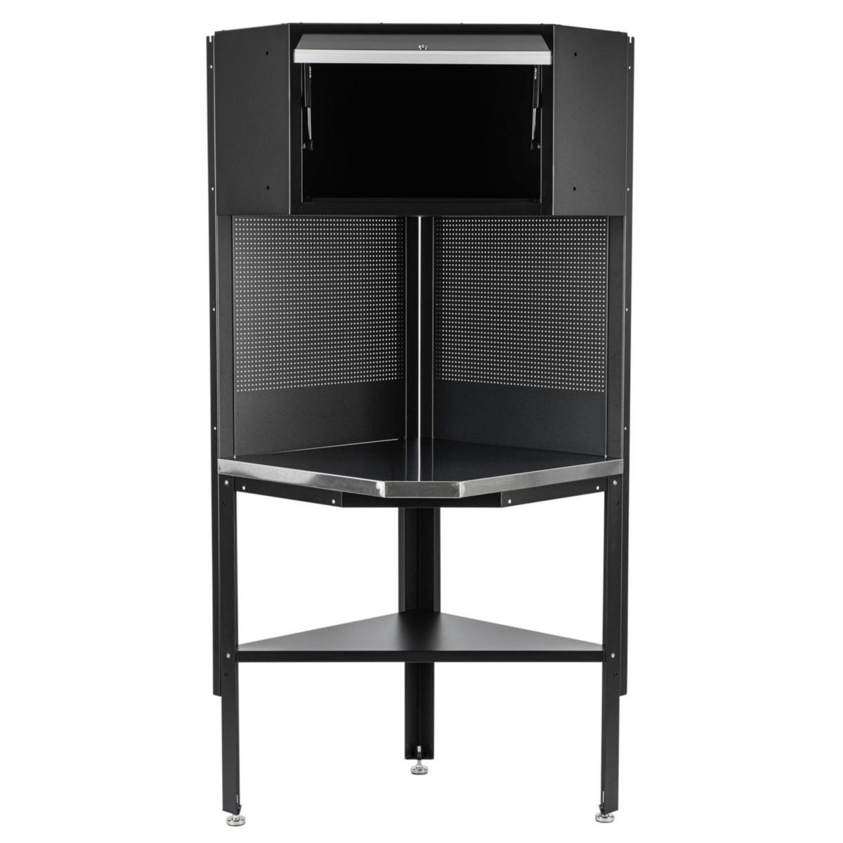 Med denna hörnmodul kan du möblera 1 st verkstadsinredning ARTNR: 509665 i ett hörn och skapa en sömlös övergång, eller bygga ihop 2 st partier ARTNR: 513302 och 513303. Hörnmodulen har verktygstavlor med runda hål som är kompatibla med PELA verktygskrokar. (Samma hålbild som gamla verktygstavlor av masonit.) Bordsskivan av rostfritt stål tål krävande arbetsuppgifter och är enkel att rengöra. Justerbara fötterna säkerställer stabilitet även på ojämna underlag. Hörndelen har även överskåp med gasfjädrad lucka samt en avlastningshylla under bordsskivan.