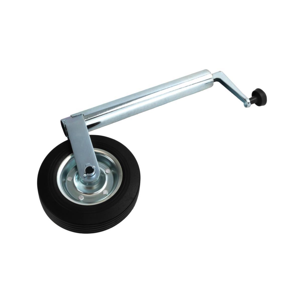 Stödhjul till släpvagn, med massivt gummihjul och rör av galvaniserat stål. Klarar en belastning på 150 kg och är justerbar i höjd mellan 36,5-58,5 cm.