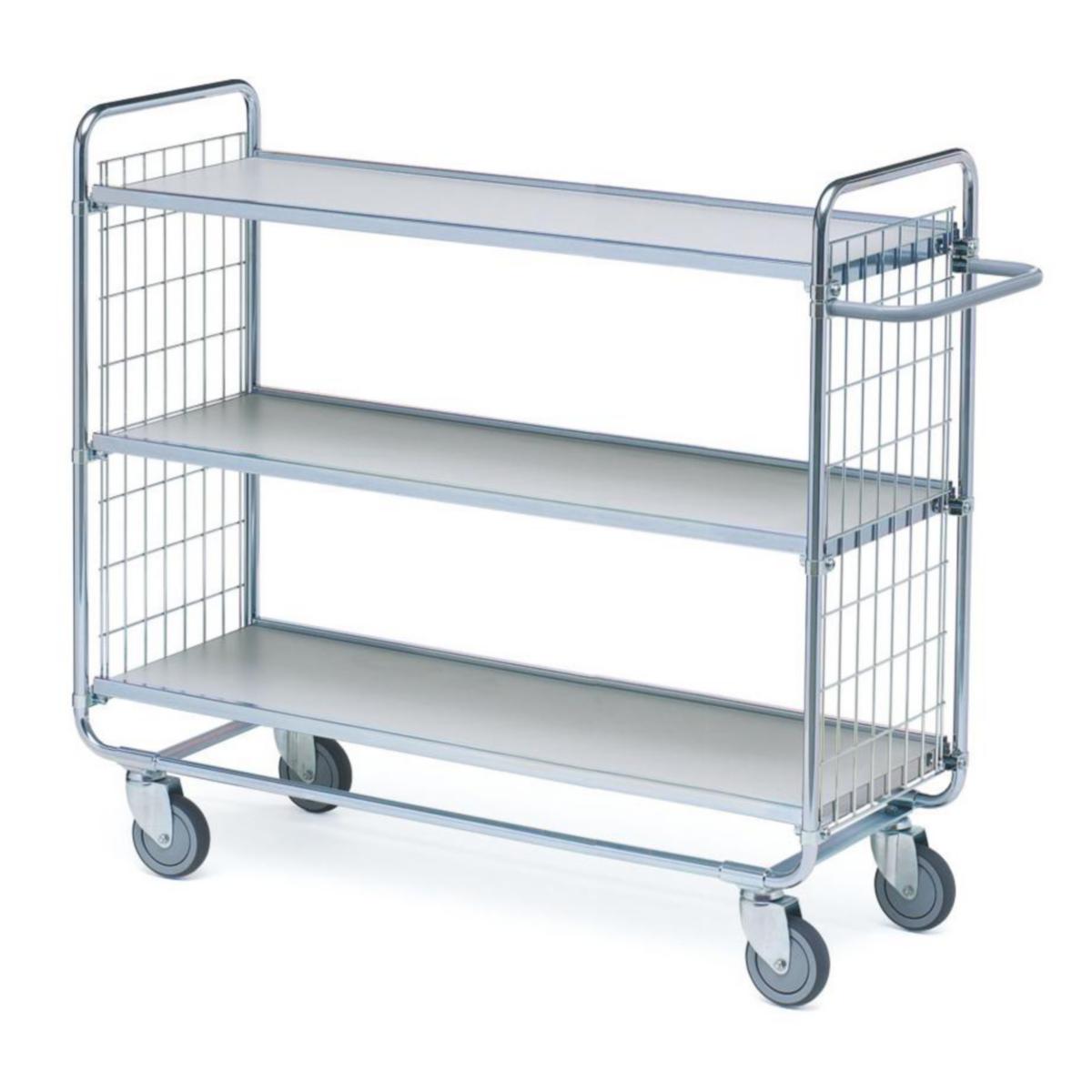 Hyllvagn med steglöst ställbara och avtagbara hyllor med ljusgrå slitstarka laminatskikt på båda sidor. Måtten på hyllorna är anpassade efter standardbackar (600x400 mm). Gavlar, hyllkanter och chassi i blankförzinkat stål. Körhandtag. Fyra länkhjul med grå gummibana 125x32 mm, kullagernav och trådskydd. Levereras omonterad. Kan även fås i ESD-utförande.