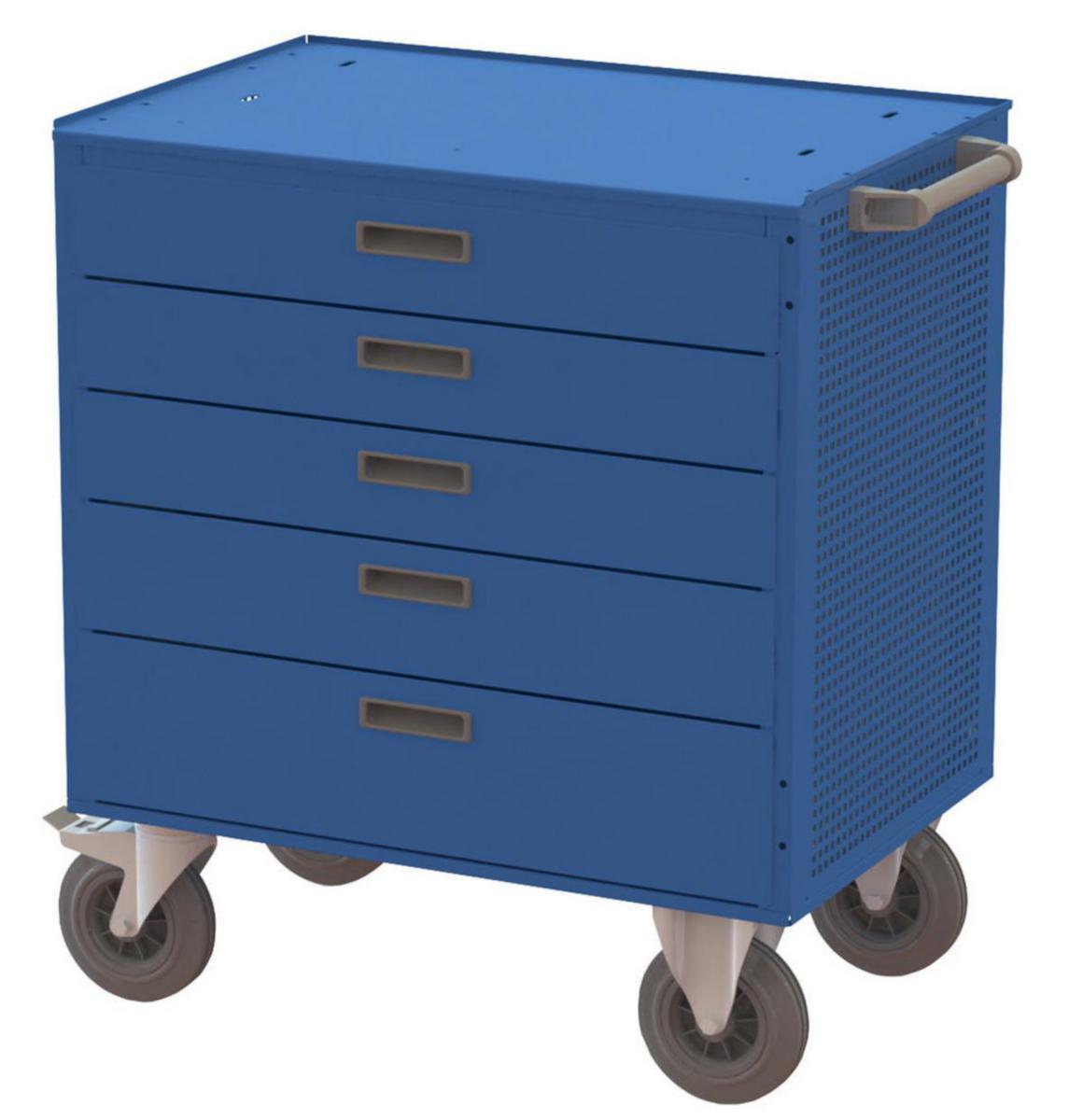 Rullbord med 5-lådig låsbar hurts och tre upphängningssidor. Gummihjul, fasta och svängbara.