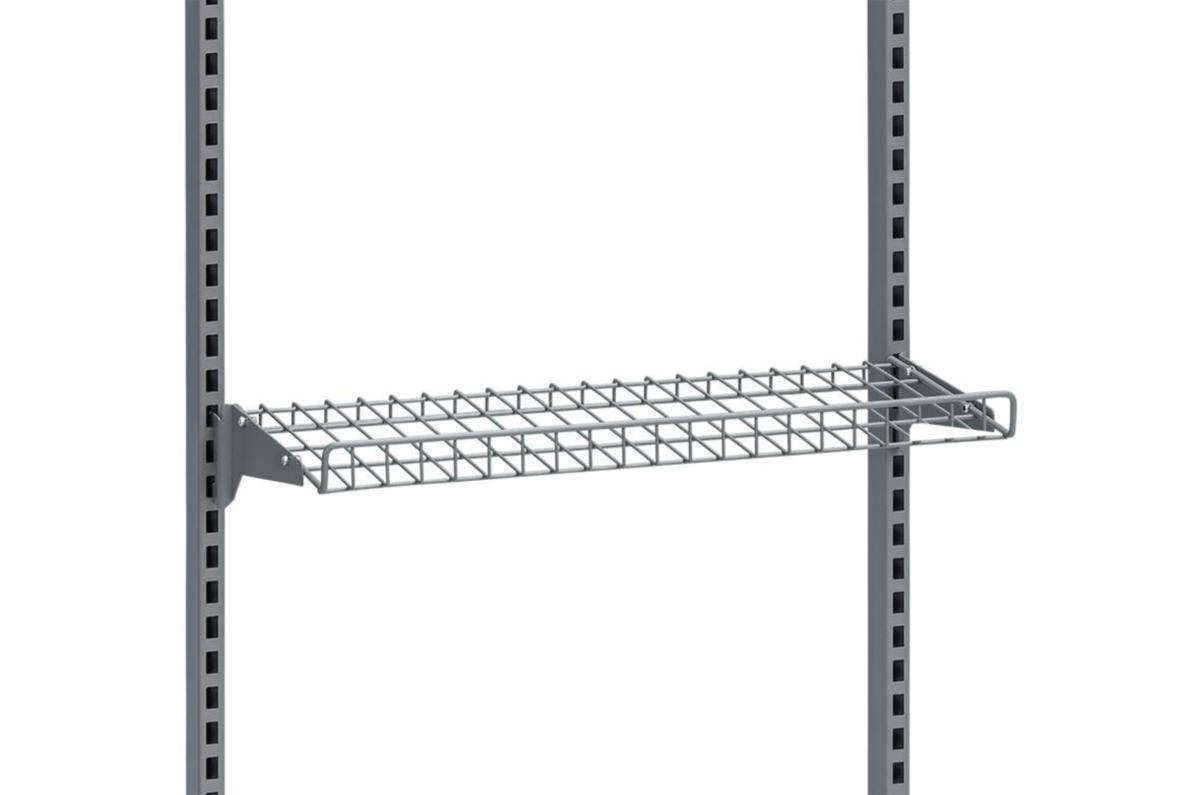 Trådhyllplan med bockad framkant som fixeras med hjälp av konsoler i vinklat eller horisontellt läge.