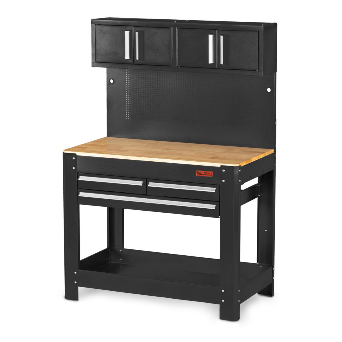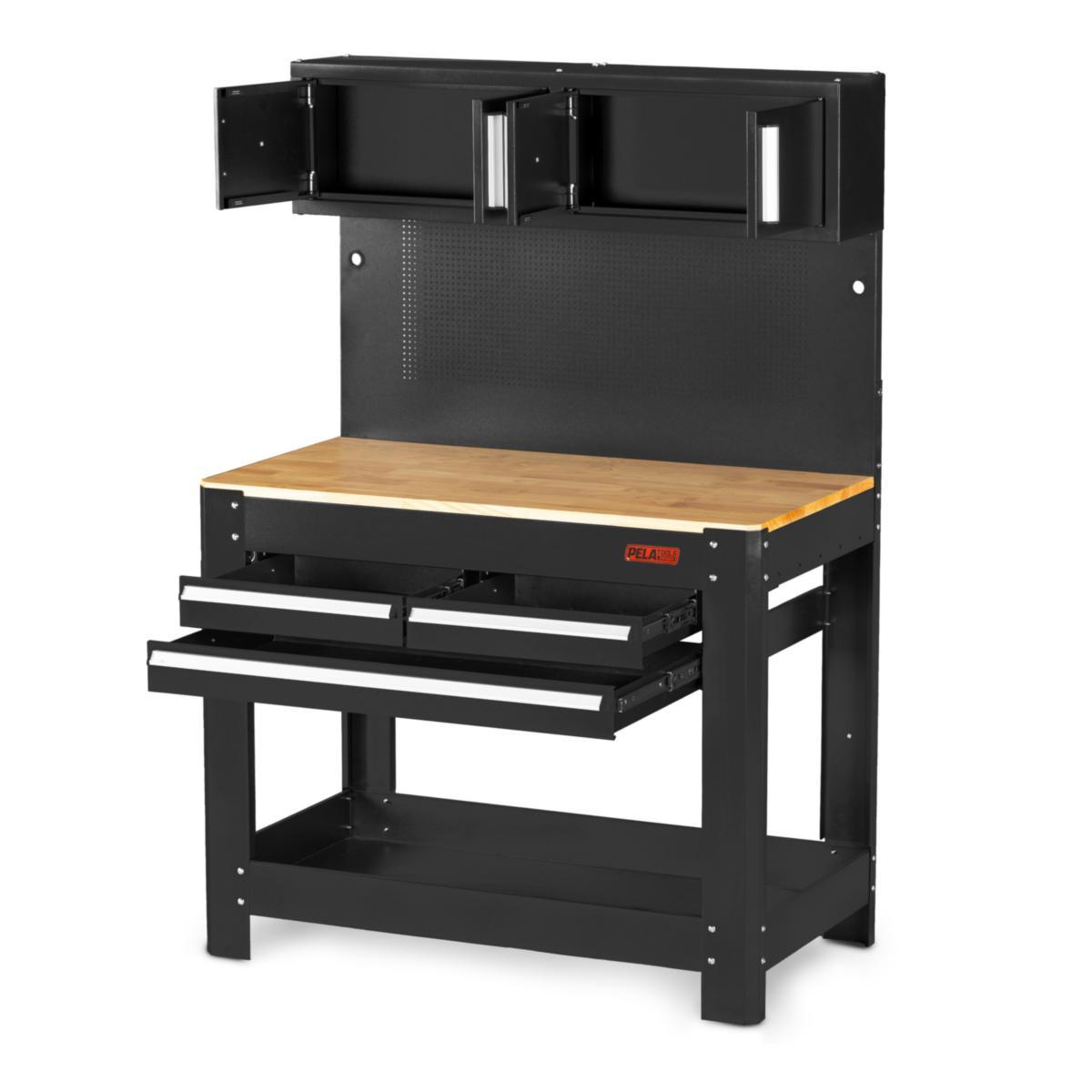 Arbetsbänk med utdragbara lådor, avlastningshylla, verktygstavla och överskåp. Arbetsbänken är tillverkad av mattsvart pulverlackerad stålplåt med en bänkskiva av trä. Under bänkskivan hittar du 3 st utdragbara kullagrade lådor och nedanför dem en stor avlastningshylla för öppen förvaring av lådor och delar. Monterat på bänken finns en verktygstavla med runda hål som går att komplettera och skräddarsy med pela’s sortiment av verktygskrokar och andra hållare för upphängning för dina verktyg och tillbehör. Ovanför verktygstavlan sitter 2 stycken överskåp med dörrar som är perfekt för förvaring av burkar och flaskor. På ena kortsidan av bordet finns även krokar för upphängning av verktyg med mera.