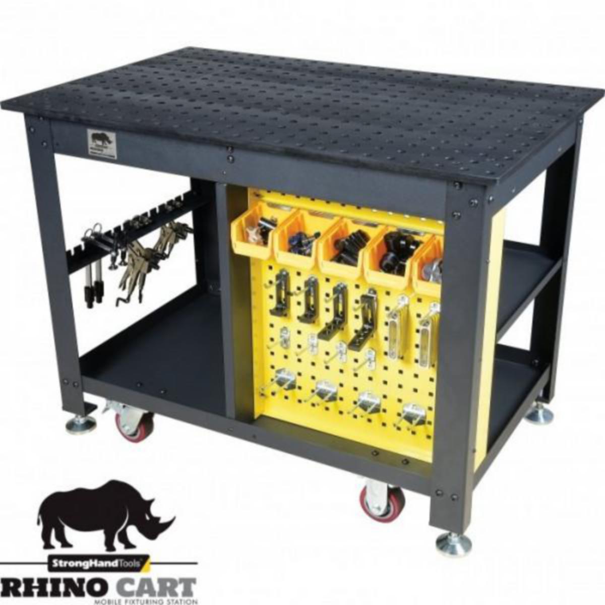 The Rhino Cart - Komplett Svetsbord med värmebehandlad arbetsyta och 66 delar för fastspänning och fixtur. Hålmönster 50 x 50 mm. Håldiameter 16 mm. Arbetsytan är vändbar och resistent mot rost, repor och svetsstänk.