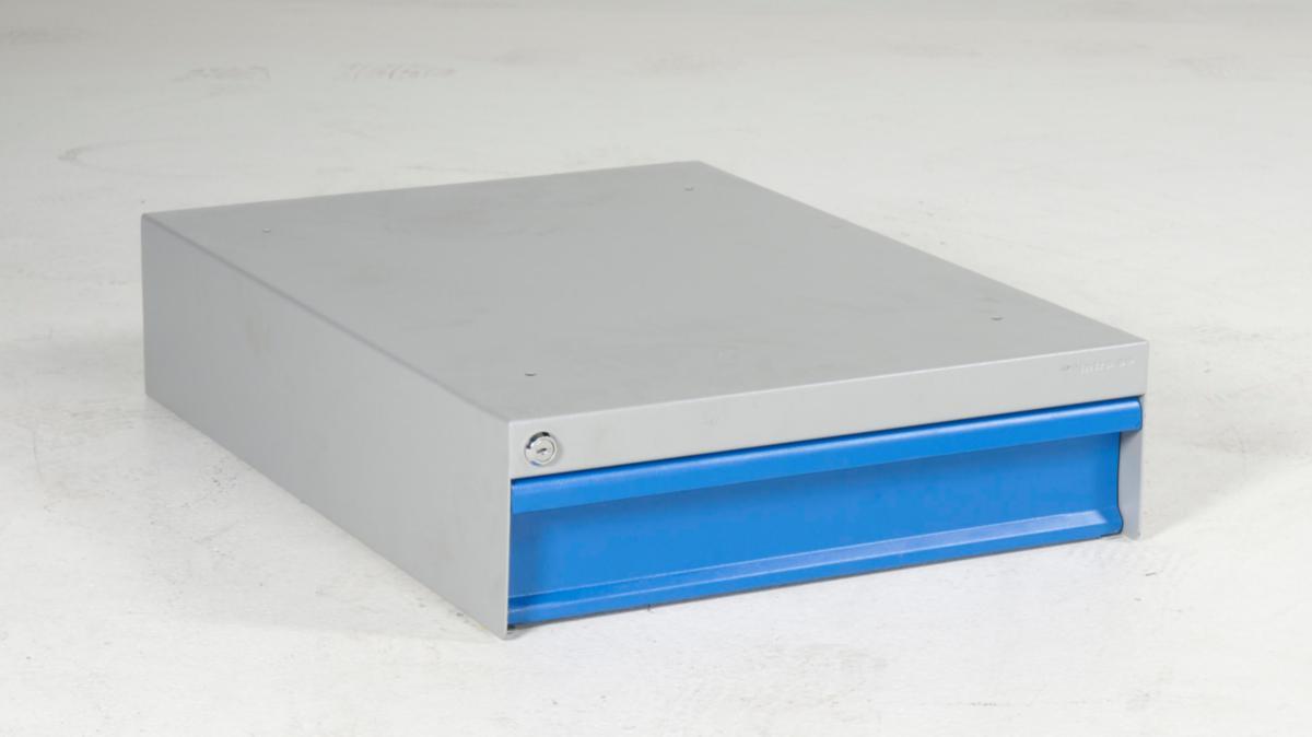 Förvaringslåda för montering under bordsskivan på arbetsborden. Låsbar med cylinderlås och kullagrad expansion med 100% utdragbarhet. Kapacitet per låda 40 kg. Innermått: (LxBxH): 606x450x100 mm.