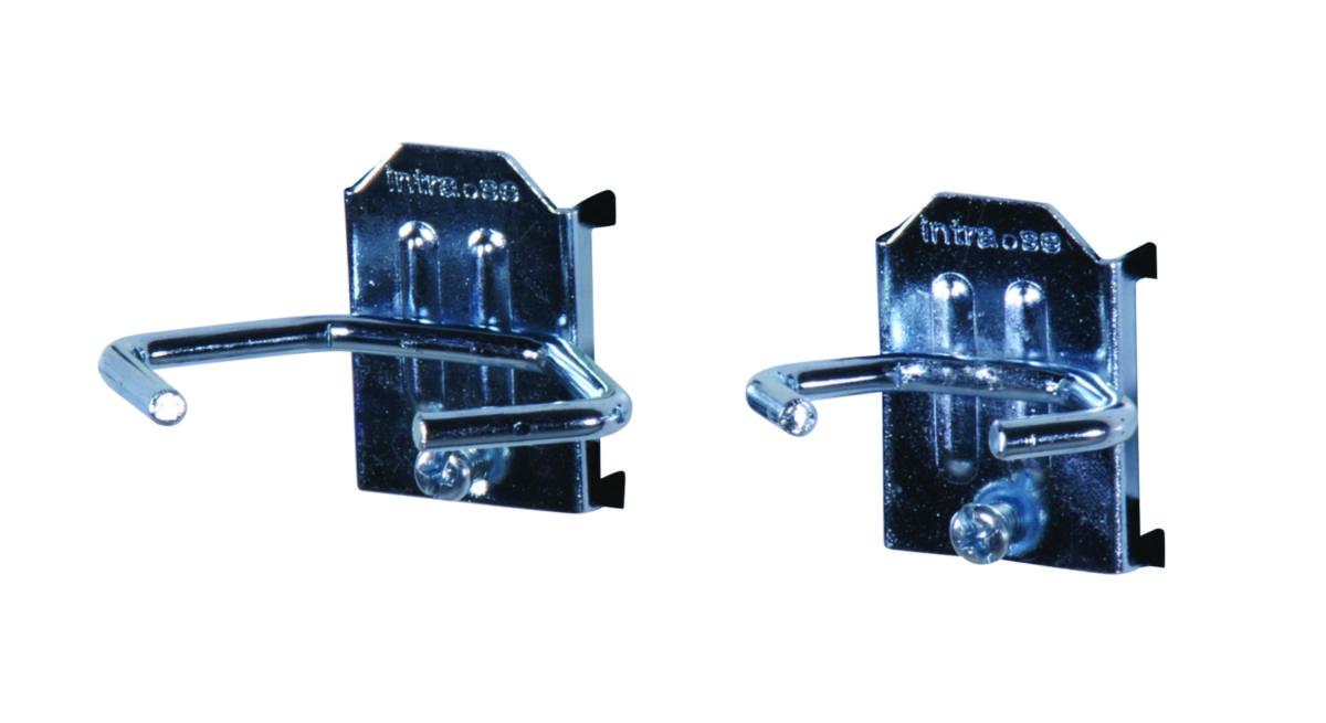 Bygelkrok för diverse tänger eller liknande gräppverktyg. Förzinkad. Kroken passar perforerade paneler, där den hakas i plåtens perforering och låses med stoppskruv.