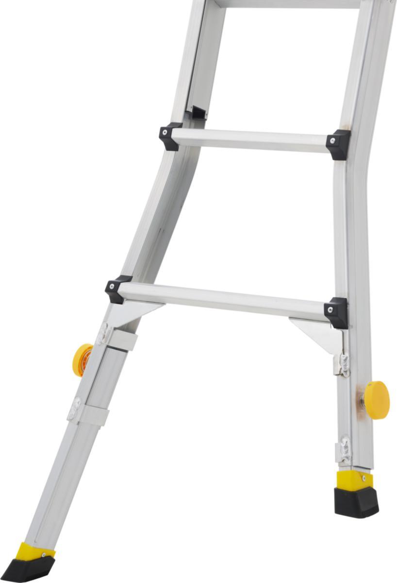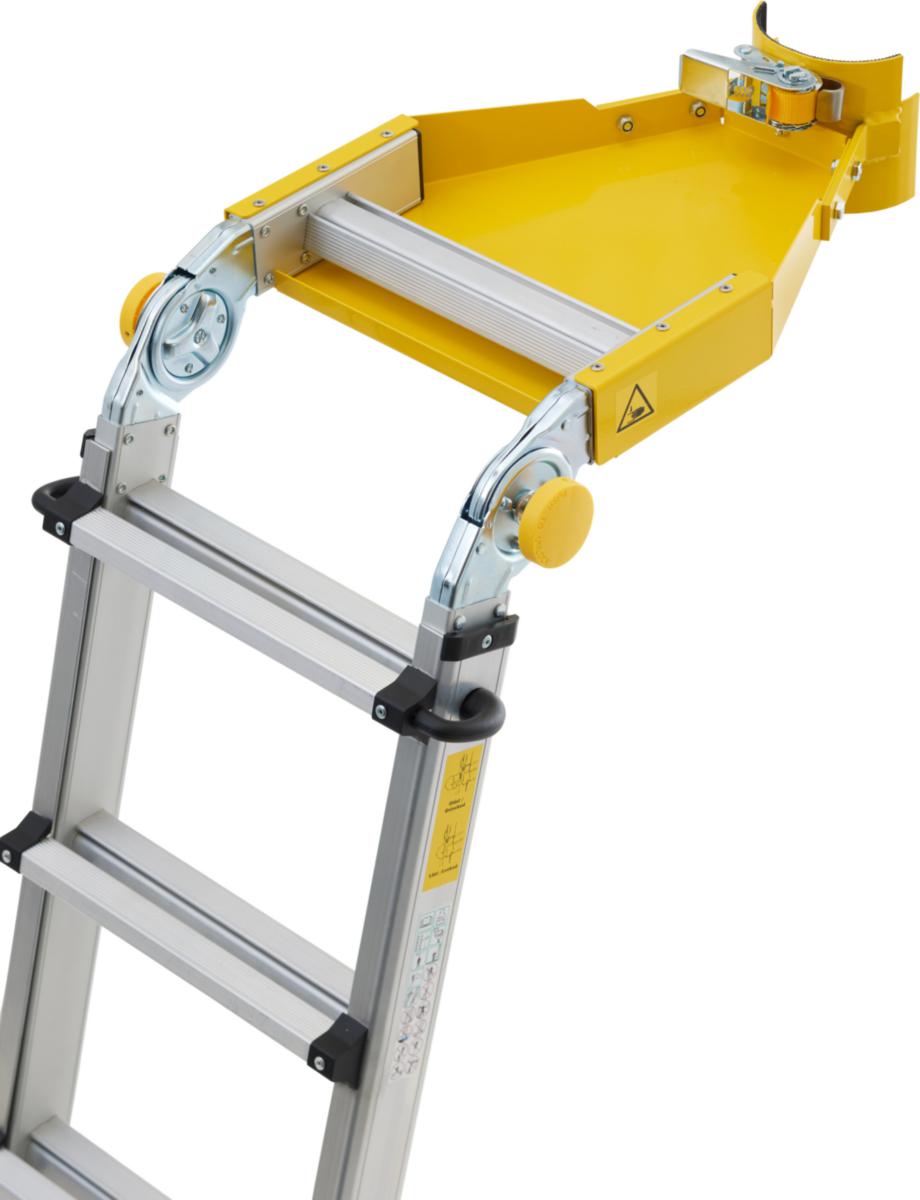 En smart, kompakt stege som kan fästas säkert på skyltar och stolpar. Den gummiklädda stolphållaren passar både runda och fyrkantiga stolpar med en diameter upp till 130 mm. Stegen har även en rem som kan spännas runt stolpen för extra säkerhet och stabilitet. En stor verktygshylla ger bra distans mellan dig och stolpen vilket ger en bättre arbetsställning. Toppdelen är ledad och teleskopisk och gör stegen kompakt vid transport. En bred bas ökar stabiliteten och benen erbjuder upp till 200 mm nivåutjämning för arbete på ojämna underlag.