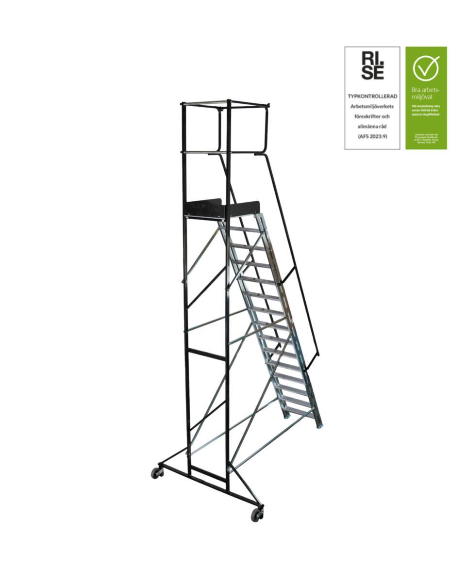 En trygg och stabil arbetsplattform ovan mark. Stommen är tillverkad av förzinkat stål. Plattformen (500×600 mm) och stegen (500×110 mm) består