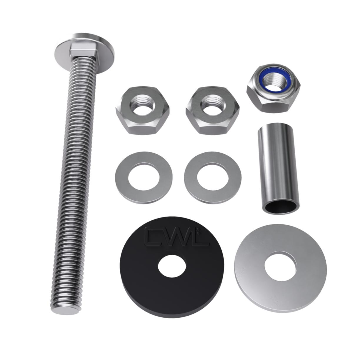 Skruvsats för montering av hybridsystem. Innehåller: 1st Tätningsbricka 35mm - 470119 1st M10 x 100 - 8.8 din 933 - 480007 1 st Låsmutter - M10 A2 DIN985– 480022 2st Bricka 10,5 din 125 A2 - 480064 2st Mutter M10 - 480065 1 st Montagehylsa - 410078 1st Bricka - 10,5 x 30 x 2 A2 DIN 9021 - 101002